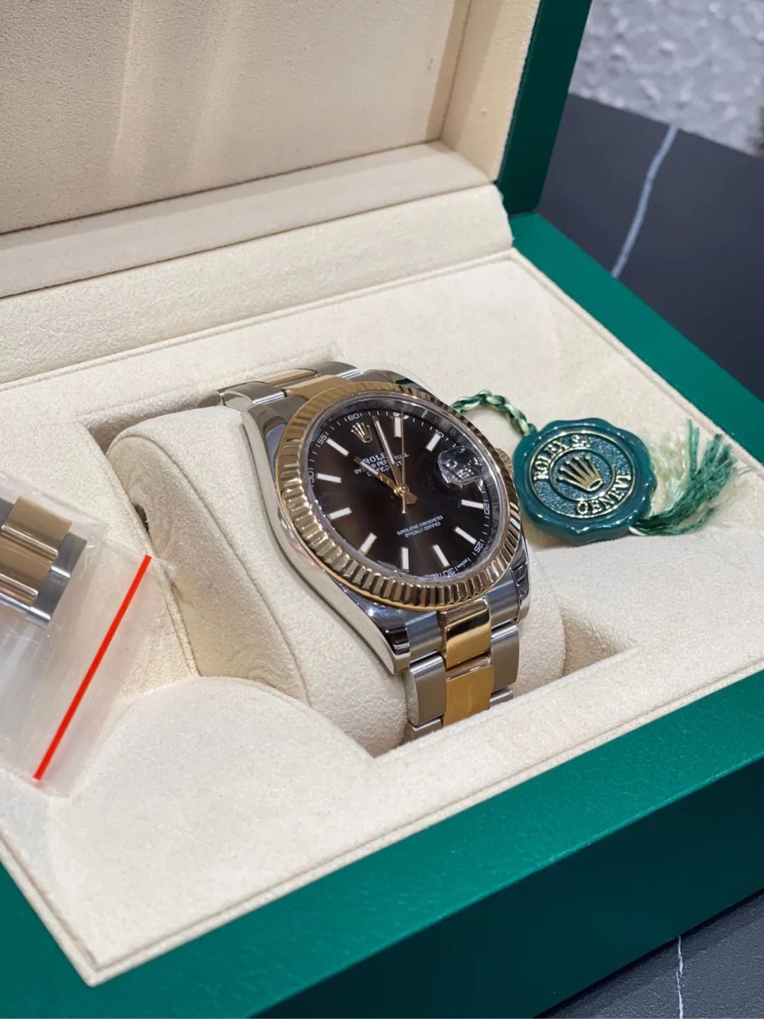劳力士Rolex日志型126333间金自动机械机芯,99新黄金配钢黑色表盘。表径41毫米,乱码,配件如图全长表节。