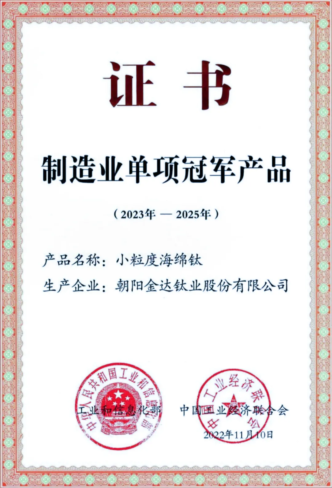公司是国家工信部首批授予的制造业单项冠军培育企业,公司生产的小粒度海绵钛系“制造业单项冠军产品”。是有色金属协会钛锆铪分会副会长单位,产品销往十余个国家和地区。