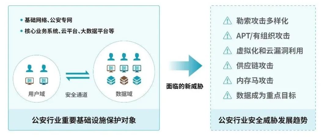 从公安行业的整体威胁发展趋势来看,公安基础网络、公安专网、核心业务系统、云平台等面临多种新的安全威胁,总体表现为网络攻击组织化、勒索攻击多样化、云漏洞攻击增多、供应链威胁严重、数据泄露风险加大等趋势。