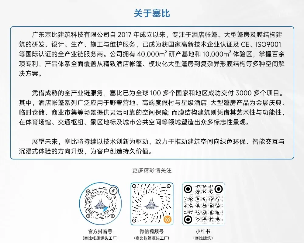 塞比篷房拥有近10年的行业经验,厂房面积超4000平方米,产品远销全球100多个国家。