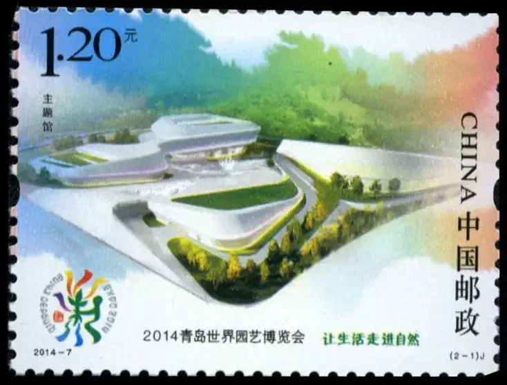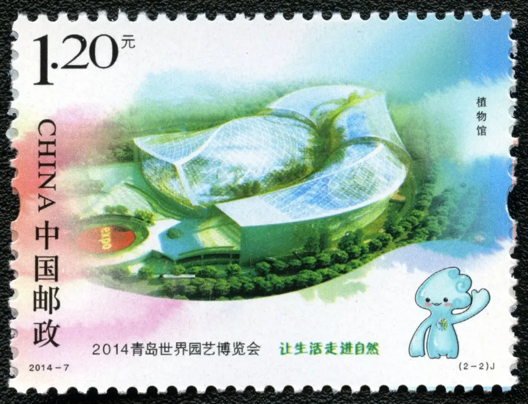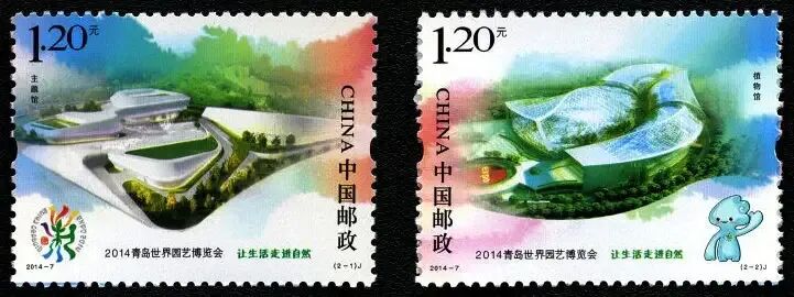 △2014—7:2014青岛世界园艺博览会2014年4月25日,中国邮政发行2014—7:2014青岛世界园艺博览会纪念邮票,一套2枚。2014年青岛世界园艺博览会(简称“青岛世园会”)于2014年4月25日至10月25日,在青岛李沧区百果山森林公园举行,会期184天。主题为“让生活走进自然”(From the earth,for the Earth),旨在倡导人与自然和谐相处、绿色生态低碳的发展理念。△(2-1)主题馆会徽为“七彩花艺”,吉祥物为“海精灵——青青”,充分体现了齐鲁文化、海洋文化、民俗文化以及园林艺术有机融合的深厚底蕴,彰显了青岛山海城浑然一体的城市特征。△(2-2)植物馆该套邮票设计将主题馆和植物馆置于邮票画面中心,背景以渐变的泼彩写意,将建筑融入画面,用写意的手法,将园林艺术与人文生活结合起来,生动诠释了2014青岛世界园艺博览会“让生活走进自然”的主题以及世园会的地域特征。