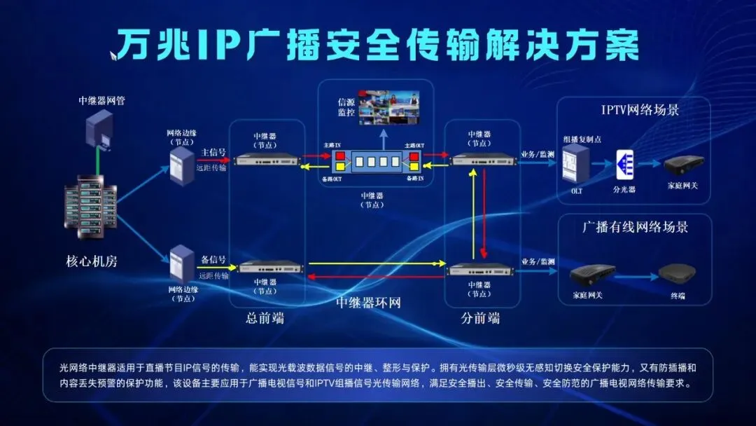 在第三十二届中国国际广播电视信息网络展览会(CCBN)展会上。吉视传媒旗下北京吉视汇通科技有限公司,携万兆IP广播安全传输解决方案亮相,以自主核心技术为广电安全传输提供全场景保障,彰显新型广电网络建设中的硬核实力。作为吉视传媒落实“十五五”规划、布局高质量网络、高安全保障的关键支撑,该方案以光网络中继器为核心设备,集信号中继、整形与保护于一体,全面适配广电网络高标准传输需求。北京吉视汇通软件研发工程师杜文贵介绍:“本次CCBN我们带来了万兆IP广播安全传输解决方案,以光网络中继器为核心设备,具备信号中继、整形与保护能力,支持微秒级无感知主备切换,拥有防插播及内容丢失预警功能,通过环形组网与星形组网实现链路冗余保护,全面满足安全播出、安全传输、安全防范的广播电视网络传输要求。”方案依托万兆IP广播技术底座,实现传输、切换、防护三位一体,可有效应对链路故障、信号干扰、非法入侵等风险,为4K/8K超高清直播、重要安全播出任务提供稳定可靠的技术保障。未来,吉视汇通将持续深耕广电网络安全领域,不断迭代优化万兆IP广播安全传输解决方案,以技术创新筑牢广电传输安全屏障,助力吉视传媒向国内领先的广电数智信息服务运营商高质量转型。