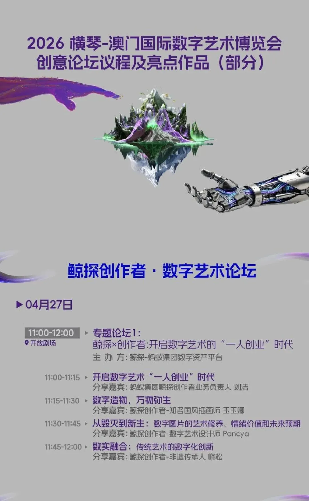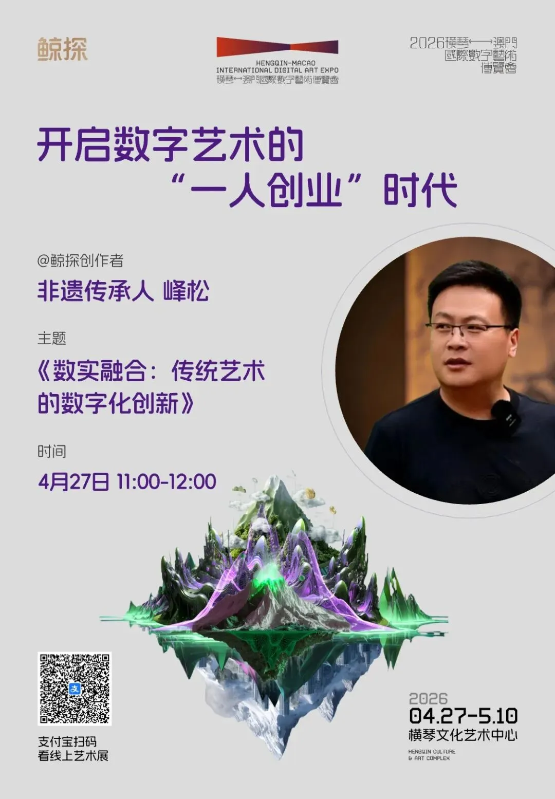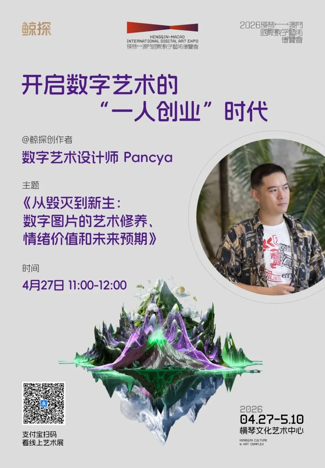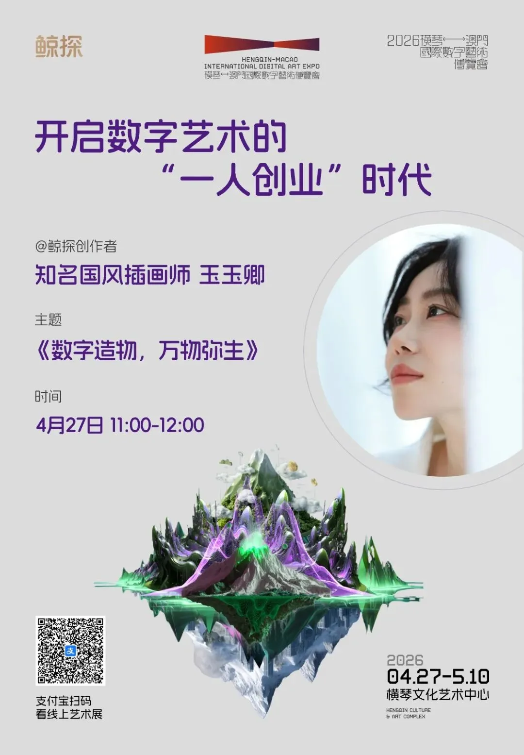 数字艺术正以前所未有的速度重塑创作与价值的边界。4月27日,鲸探将亮相2026横琴-澳门国际数字艺术博览会,不仅打造一场线下数字艺术展,更带来一场聚焦“一人创业”时代的专题论坛。