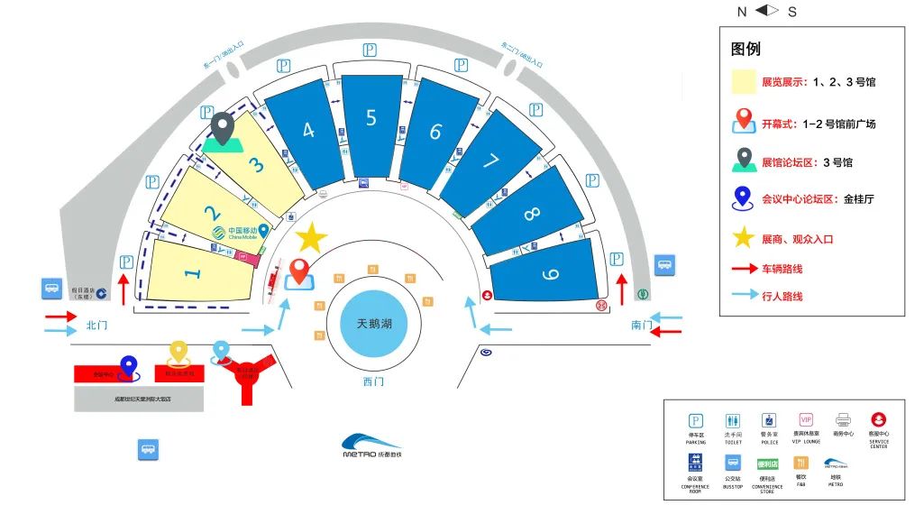 下图标记出观众入口,建议从北门入口进入展区观展。