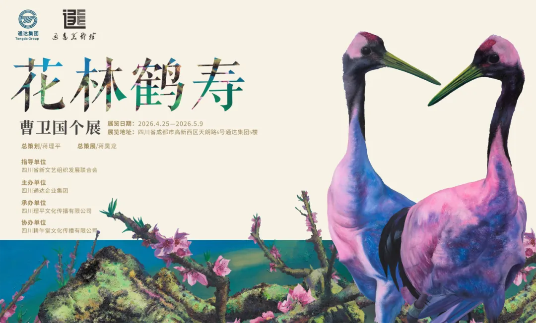 由四川省新文艺组织发展联合会指导,四川通达企业集团主办,四川理平文化传播有限公司承办,四川耕牛堂文化传播有限公司协办的“花林鹤寿”曹卫国个展,于四川省成都市高新西区天朗路6号通达集团5楼展出,展期为2026年4月25日—2026年5月9日。