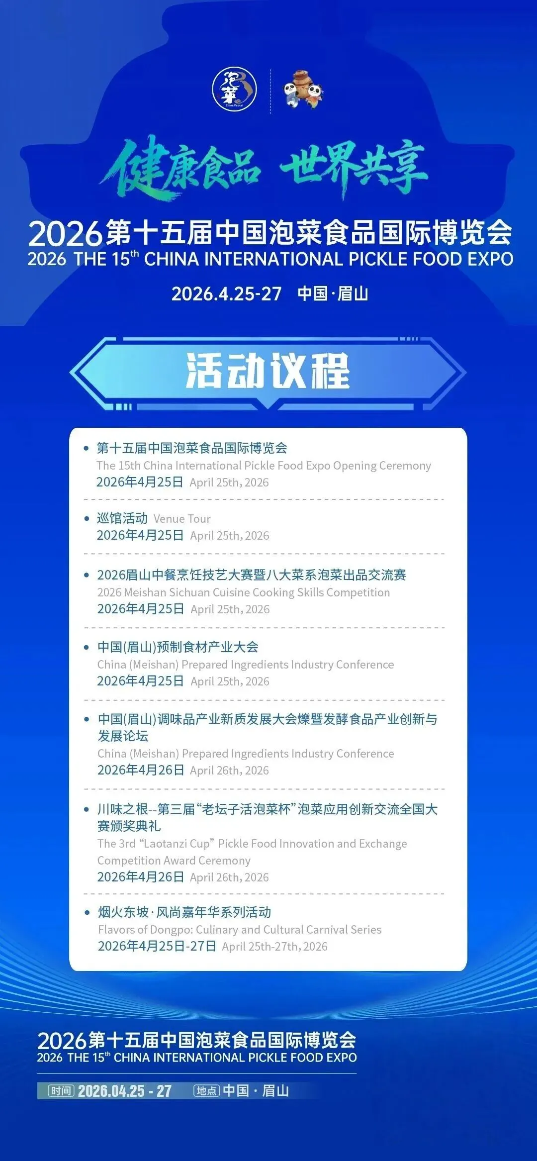 2026年4月25日至4月27日,第十五届中国泡菜食品国际博览会将在四川·眉山会展中心隆重举行!本届以“健康食品·世界共享”为主题,首次全面市场化运作,不再只是产品陈列的窗口,更是破解产业瓶颈、链接全链资源、定义未来标准的战略平台。