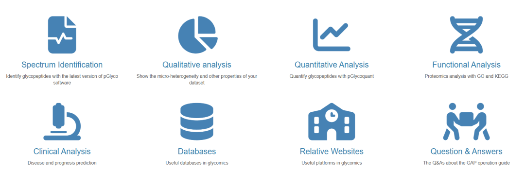 全面的糖基化分析平台,包含了对糖肽、糖链、糖蛋白的定性、定量、富集和临床等分析流程,可直接对pGlyco3.0和pGlycoQuant的数据结果分析