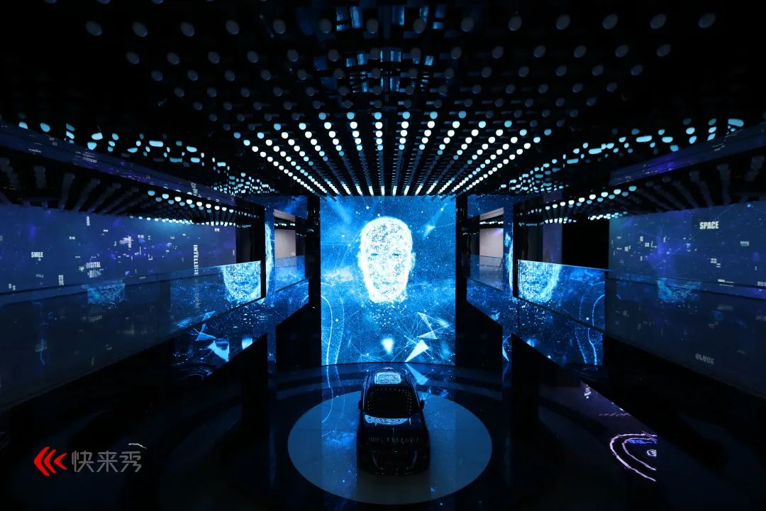 二层诠释红旗勇敢探索“技术赋能城市”的展示诉求,通过机械动力雕塑、人脸识别实时渲染、5G直播等各类展示黑科技,用最梦幻的方式呈现红旗科技创造的美好生活、美妙出行。