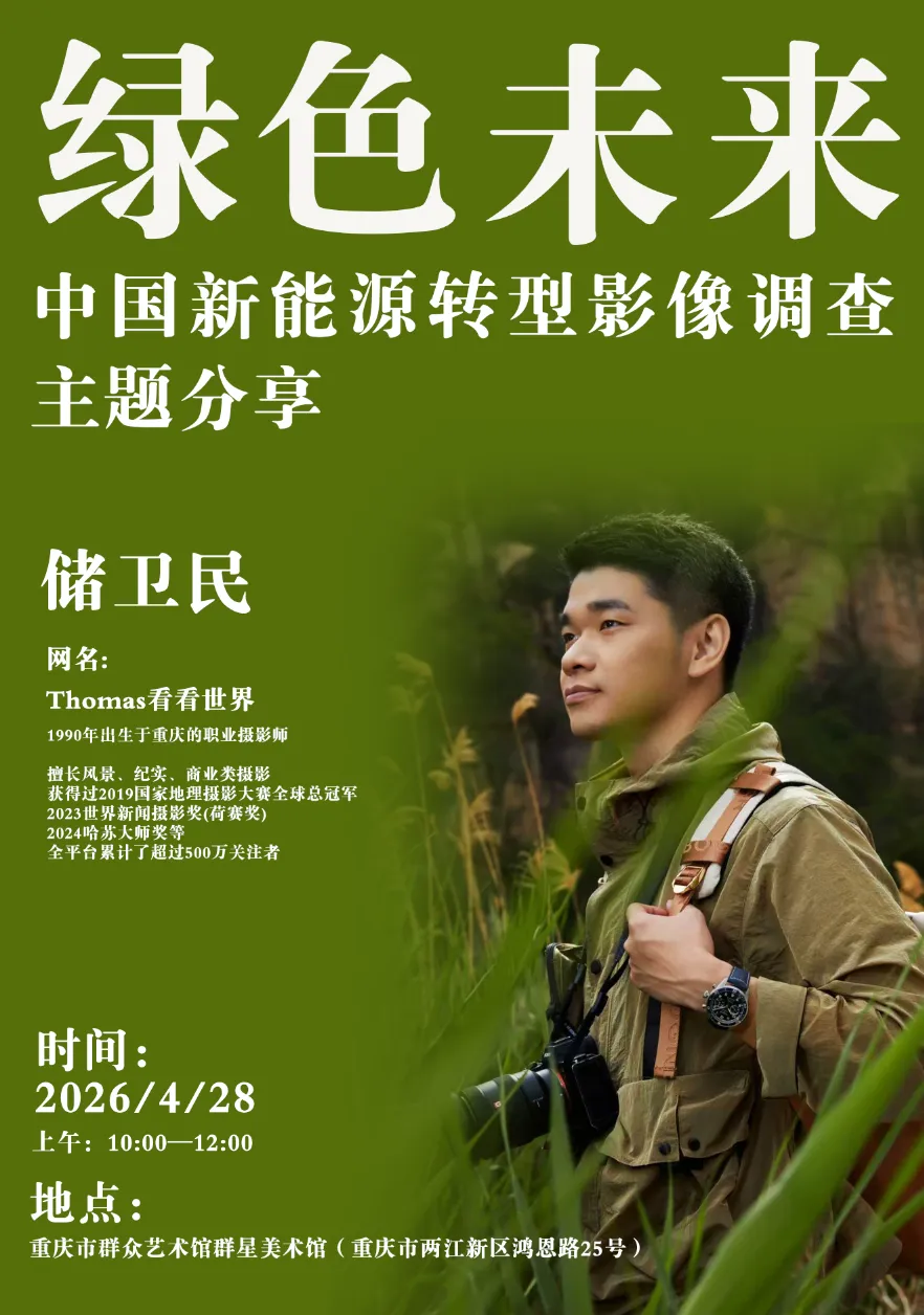 为深入践行绿色发展理念,大力传播生态文明思想,推动新能源产业发展成果与群众文化艺术深度融合,营造全民关注绿色低碳、守护生态环境的良好社会氛围,《绿色未来》——中国新能源转型影像调查主题摄影展将于2026年4月28日(星期二)9:30在重庆市群众艺术馆群星美术馆开幕。开幕式结束后,储卫民、那日松将分别进行《<绿色未来>——中国新能源转型影像调查》和《摄影人的三个进阶:展览,出版和收藏》的分享。