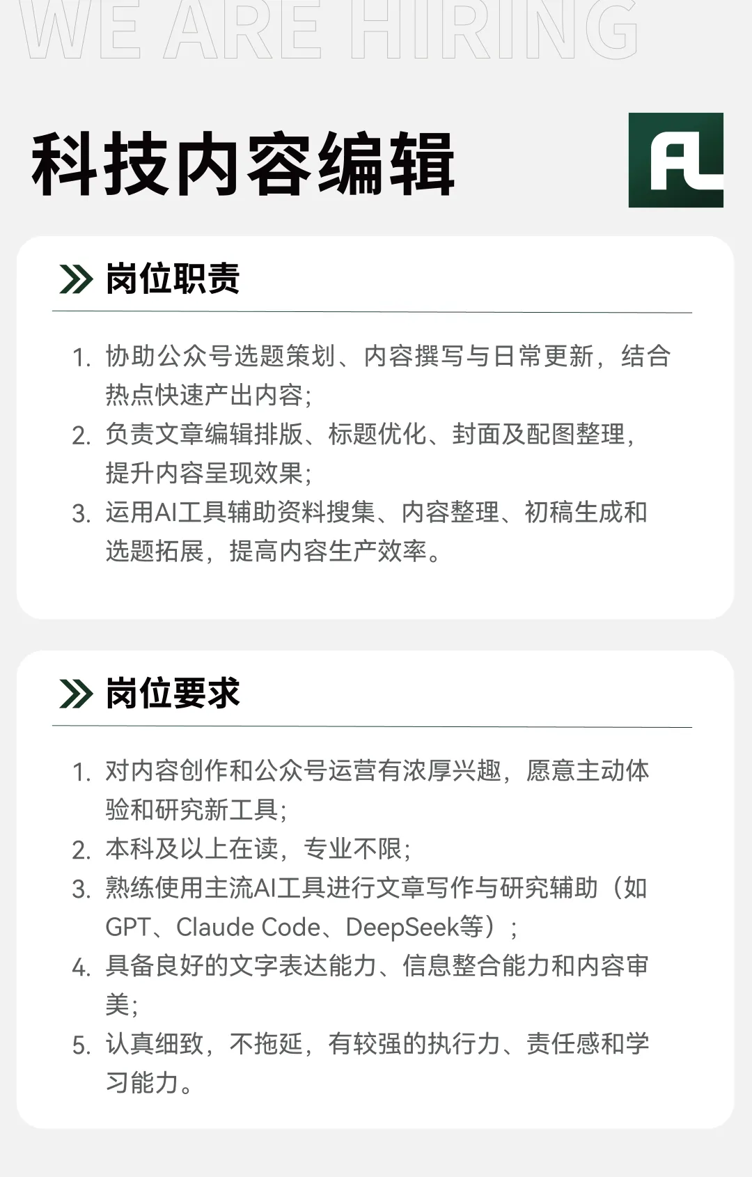- 简历文件名及邮件标题统一格式为:应聘扶林科技内容编辑 + 姓名 + 学校 + 专业 + 学历年级 + 每周 X 天 + 可保证最少实习期限 + 所在城市