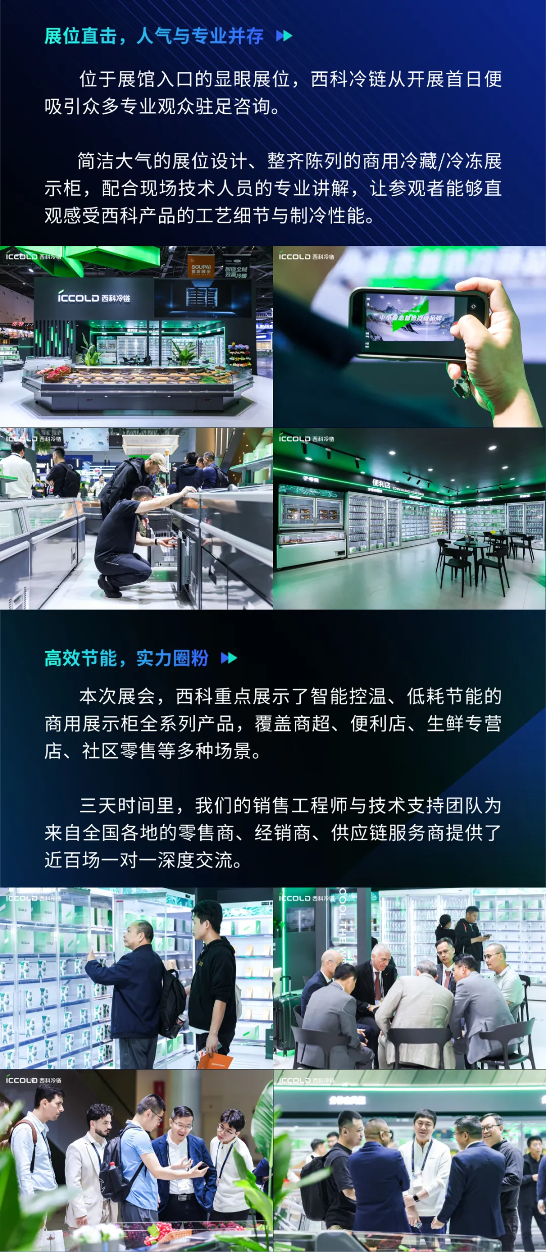本次展会,西科重点展示了智能控温,低耗节能的商用展示柜全系列产品 覆盖商超,便利店,生鲜专营店,社区零售等多种场景。