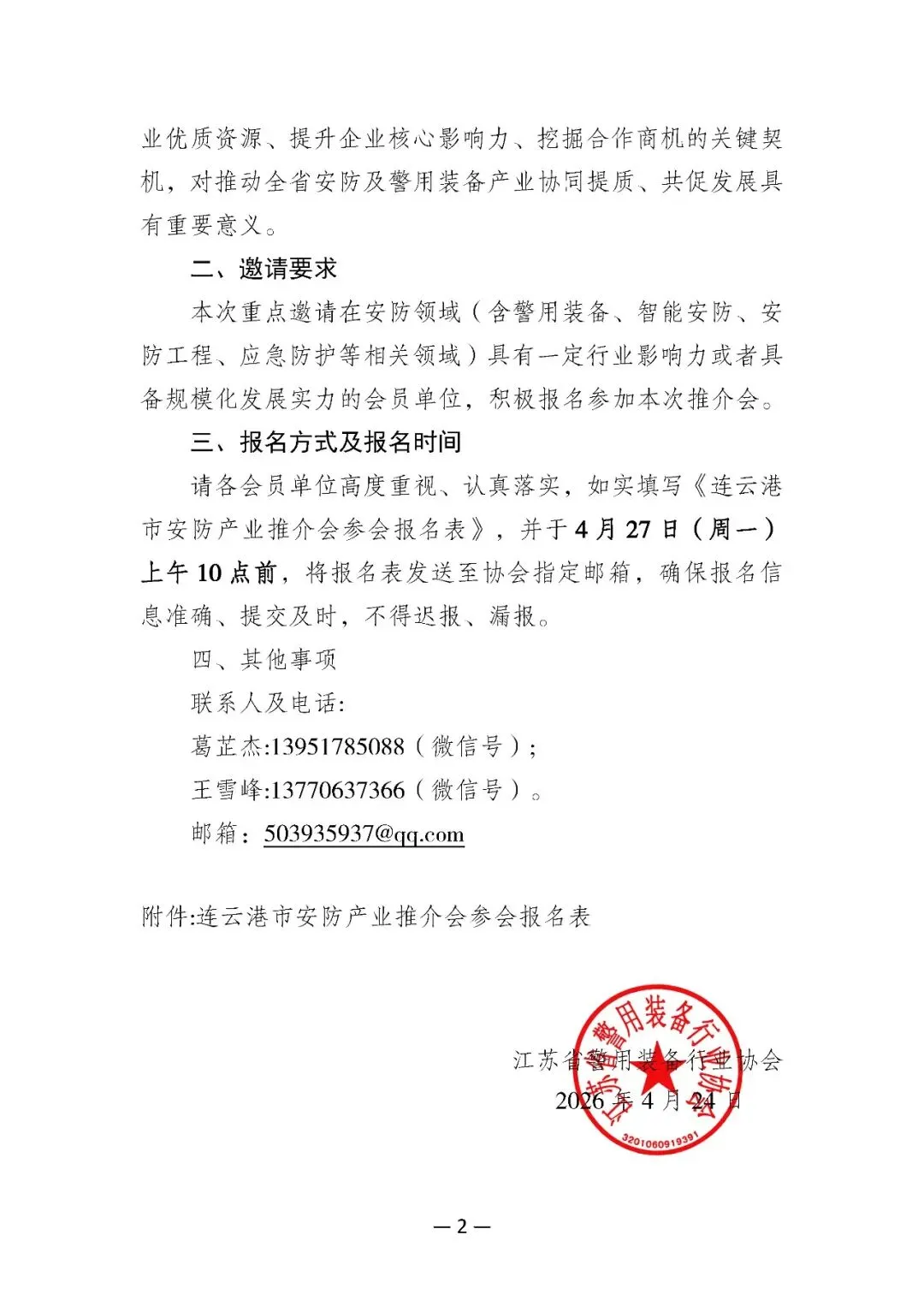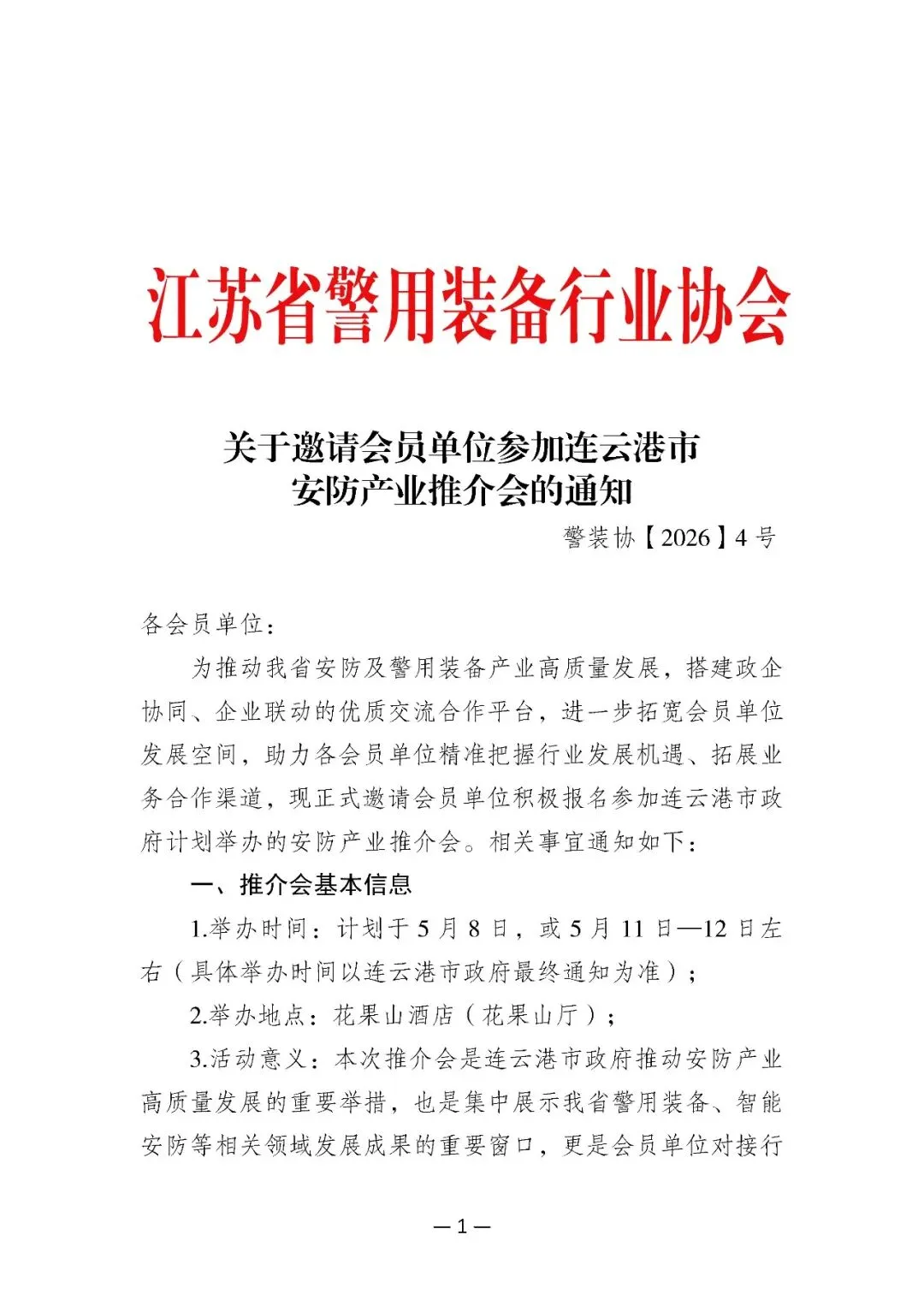 关于邀请会员单位参加连云港市安防产业推介会的通知