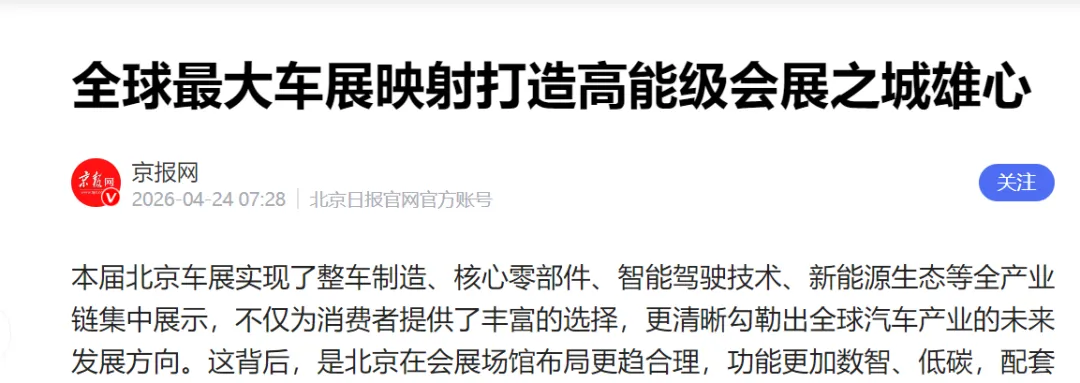 最近我发现一件很有意思的事,终于有媒体敢光明正大用上“全球最大”这类字眼了。熟悉行业的人都清楚,新广告法实施之后,像全球最大、中国第一、行业之最这种绝对化宣传,基本上没人敢随便乱用。以前遍地都是各种“最大”“顶级”的宣传口号,现在全都销声匿迹,主办方做宣传都小心翼翼,生怕触碰合规红线。想起早些年的北京石油展,当年在新广告出来之前,就是靠官方报刊、领导公开讲话,直接定性它是全球最大石油展。就这么一句话,直接变成展会最强背书,常年拿来当宣传口号,含金量拉满,省心又好用。而最近,京报网,也就是北京日报官方官网、官方权威账号,新发的报道里,直接明明白白写了:全球最大车展。标题直接点题,借着这个定位,凸显城市打造高能级会展之城的发展雄心。就简简单单“全球最大”四个字,立马出圈,瞬间引爆行业关注度。说实话,干会展、做主办的我们都明白,这种顶级头衔,就是最好用的广告语,没有之一。今年规格和往年完全不一样,展览面积做到了三十八万平米,规模摆在台面上,硬实力足够能打。同时采用双馆联动模式,中国国际展览中心顺义馆,加上首都国际会展中心,两大展馆同步办展,体量直接拉满。主要是想从新闻传播、宣传造势的角度,跟大家聊聊这波非常取巧、非常高明的玩法。关键点就在这:主办方自己不能喊、不能自我标榜,这是广告法的硬性规矩。但如果是权威媒体、官方平台、权威人士,从官方口径里客观说出这些定位词,性质就完全不一样了。相当于白捡一个顶级宣传标签,不用花钱推广,不用刻意营销,公信力直接拉满。现在会展行业内卷这么严重,展会数量越来越多,同质化严重,信息泛滥。大家都在发愁,展会到底怎么才能出圈、怎么提升知名度、怎么打动展商和观众?我们所有会展从业者,真的都该好好学一学这种思路。不靠自吹自擂,不踩法律红线,借权威第三方的发声,给自己赋能。同样一句话,自己说出来是违规宣传,官方媒体说出来,就是硬核实力认证。懂这个逻辑,展会宣传才能少走弯路,轻松破圈。