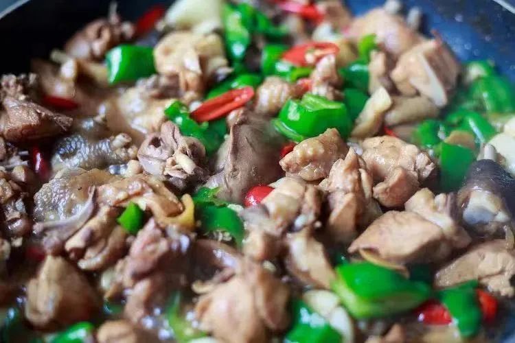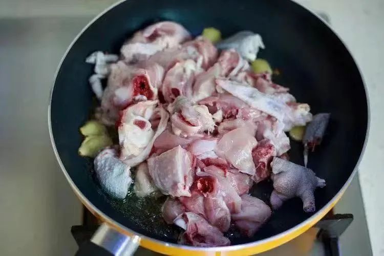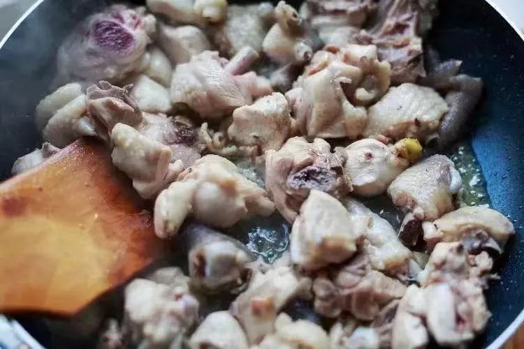 锅里倒进油放生姜片花椒,炒出香味,倒进鸡肉块,炒鸡肉可以适当多放一些油,这样鸡肉口感油润不柴。用油煸炒鸡肉,可以让鸡肉肉质紧致一些。