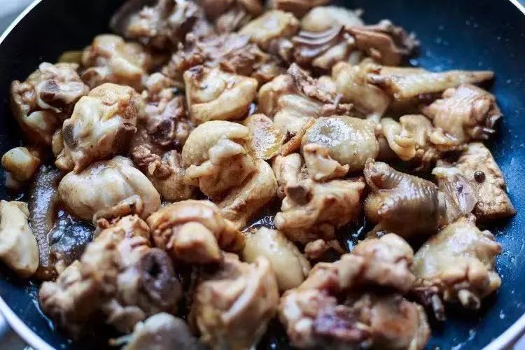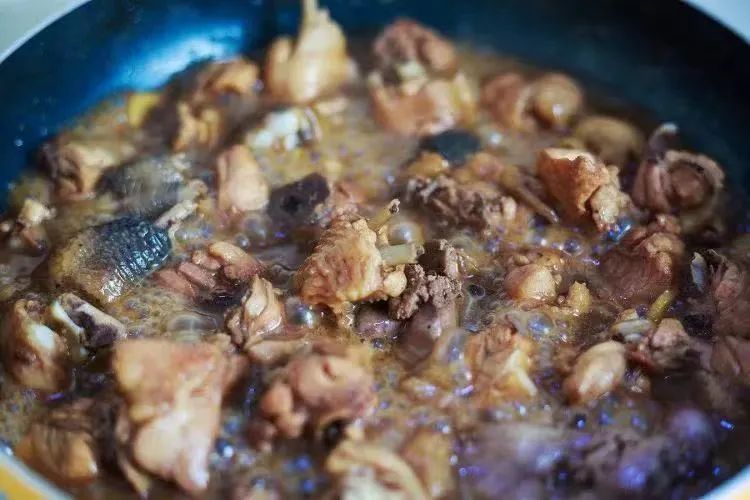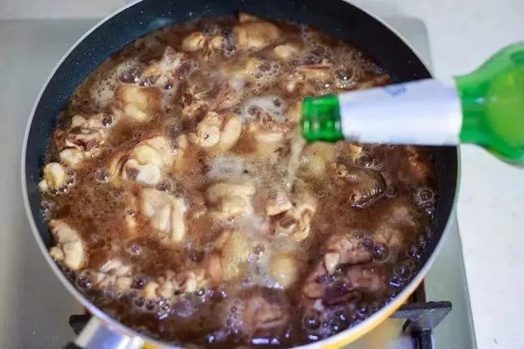 鸡肉翻炒到肉质紧缩干爽并带有焦黄色,鸡肉炒好后往锅里倒进一瓶啤酒,盖上锅盖用小火焖煮到啤酒减少。