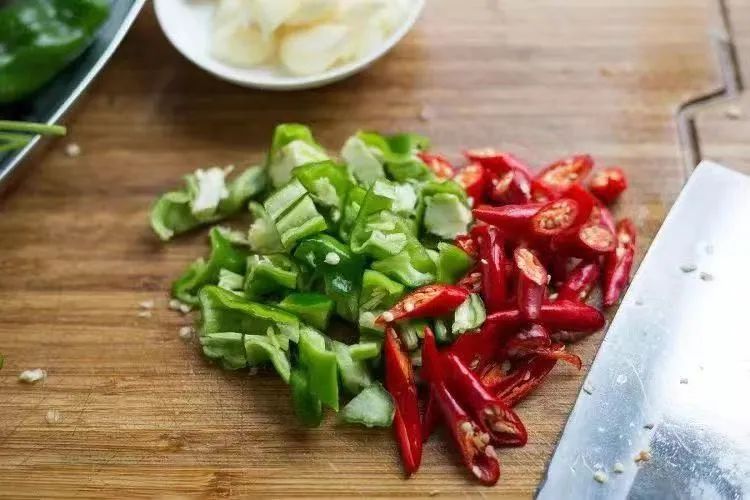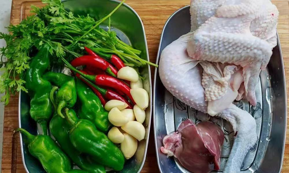 把所用食材准备好。把鸡肉洗净后剁成3厘米见方大的肉块,建议肉块剁大一点,吃着会更过瘾一些,鲜辣椒洗净,切开片掉辣椒籽后切段。红椒提高辣味,青椒可以增加菜品的维生素。生姜切片,香菜洗净切段,大蒜瓣拍松散,炒鸡时放大蒜可去除肉腥味减少油腻感。