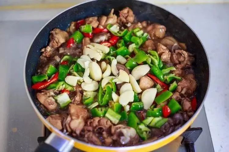 炖煮到汤汁减少,撒入盐翻炒入味,倒进切好的青红辣椒和蒜瓣,快火翻炒入味,炒到辣椒断生即可关火,临出锅时撒上香菜段。