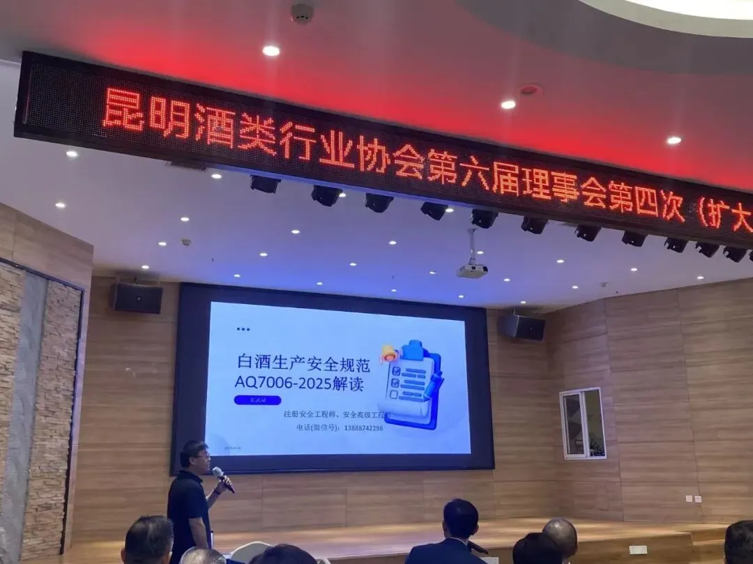 会议特邀云南省巨星注安师事务所有限公司副总工程师、高级工程师张武斌现场授课,聚焦《AQ7006-2025白酒生产安全规范》进行深度解读。结合生产实操、安全管控、质量标准等关键要点,普及安全生产新规要求,指导企业健全生产管控体系,严守食品安全与生产安全底线,助推行业标准化、规范化升级。