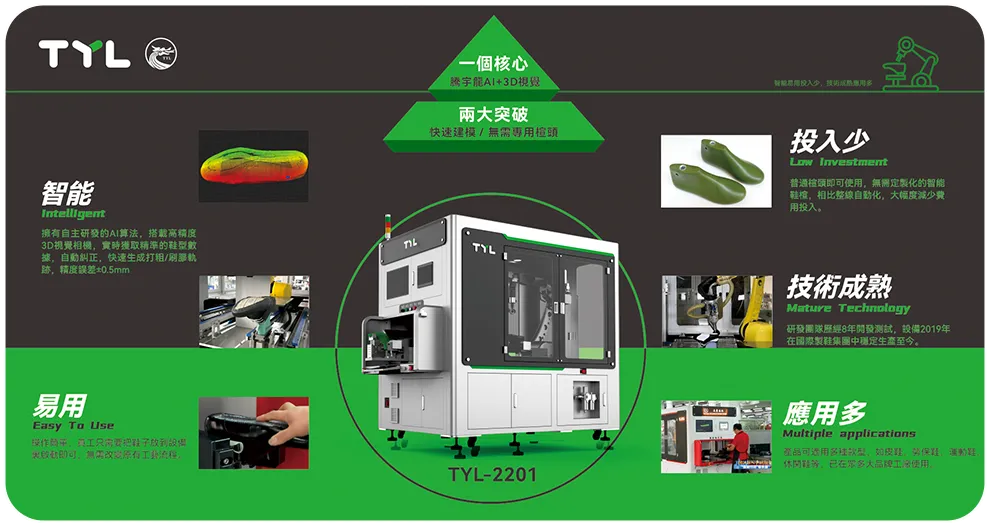 腾宇龙,源自于德国肯阳国际,二十多年来,致力于鞋机的研发与生产,我们是鞋垫转印、烫标行业的领导者,是 AI+3D 视觉打粗/喷胶机器人开创者。