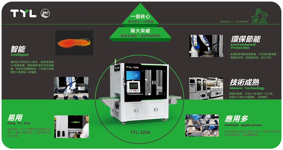 主营产品: AI+3D视觉大底喷胶机器人、AI+3D视觉打粗/刷胶机器人、成型中段智能生产线,智能大底喷胶生产线。鞋垫转印机、烫标机、削泡棉机、印刷机、智能喷墨画线机等鞋垫自动化设备。