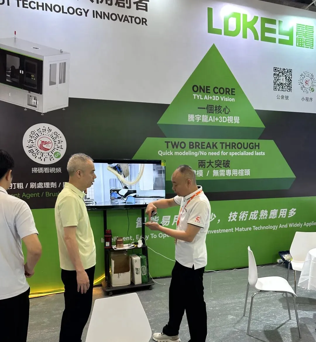 腾誉龙始终以 “科技赋能制鞋,创新驱动升级” 为理念,专注 AI+3D 视觉制鞋机器人研发制造,是行业内该技术赛道的开创者与引领者。此次亮相的AI+3D视觉打粗喷胶机器人,是腾誉龙核心王牌产品,融合3D视觉系统快速扫描采集鞋型数据、AI 智能算法、高精度运动控制三大核心技术,无需专用楦头,兼容常规标准楦头,可快速完成混合鞋帮轮廓识别与轨迹规划。其中打粗机器人10秒即可完成单只鞋打粗,精度达 ±0.5mm;喷胶机器人5秒完成单只大底喷胶,支持混款同步作业,大幅降低人工依赖,助力鞋厂降本增效。
