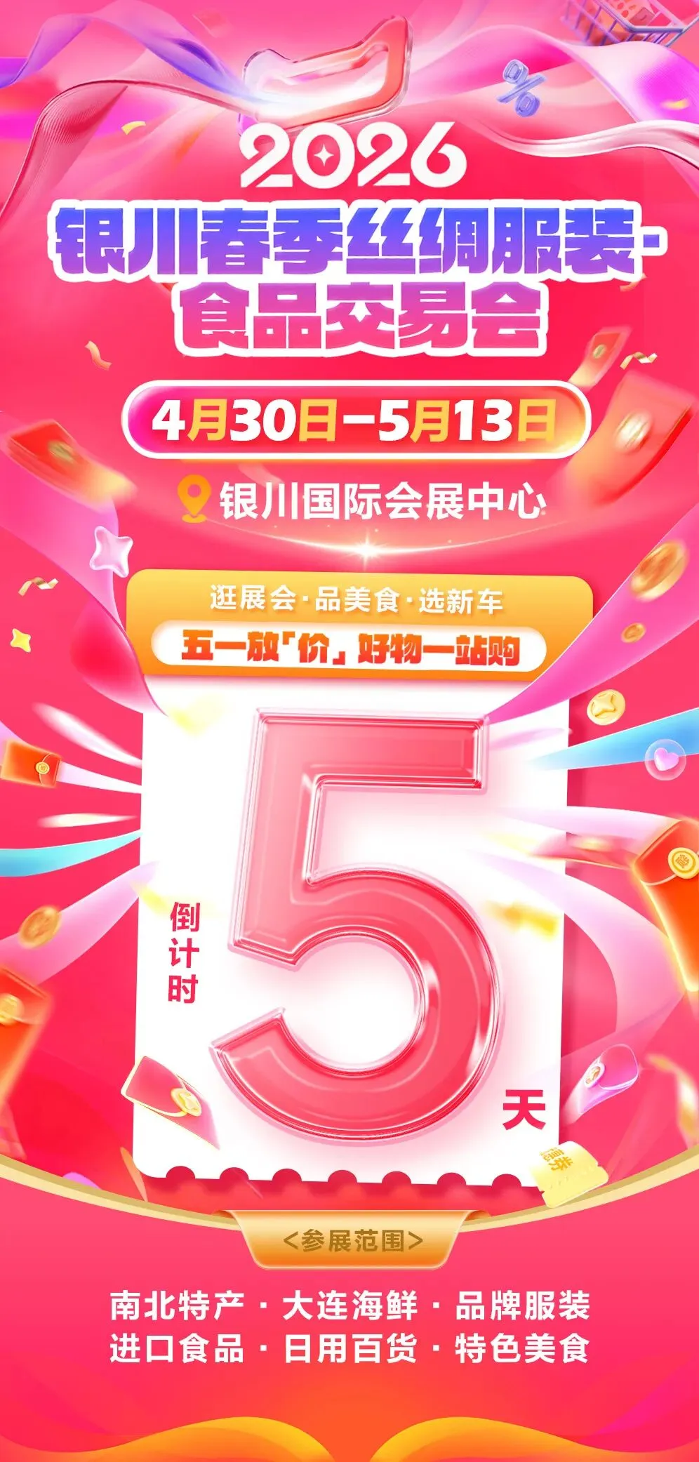 当春日的暖阳洒满银川,一场兼具时尚、烟火与实惠的盛会即将登场——银川春季丝绸服装食品交易会,定于4月30日至5月13日,在银川国际会展中心钜惠启幕,为期14天的狂欢盛宴,无需门票、免费入场,邀全体银川人共赴一场丝韵流转、食香满溢的春日之约!