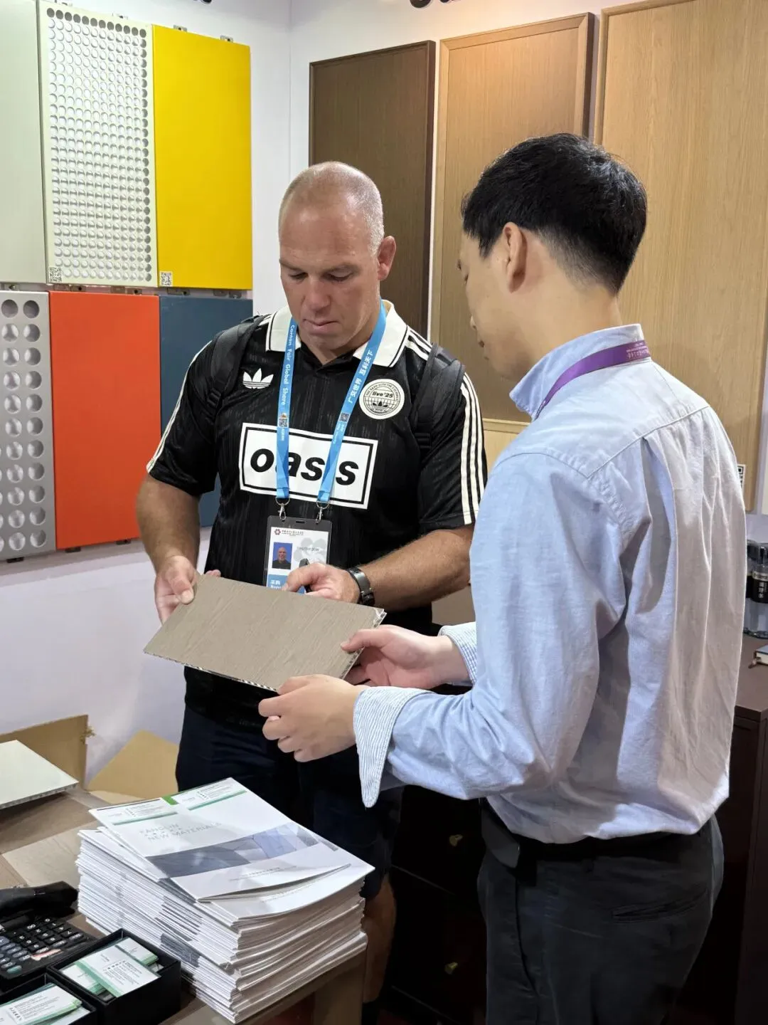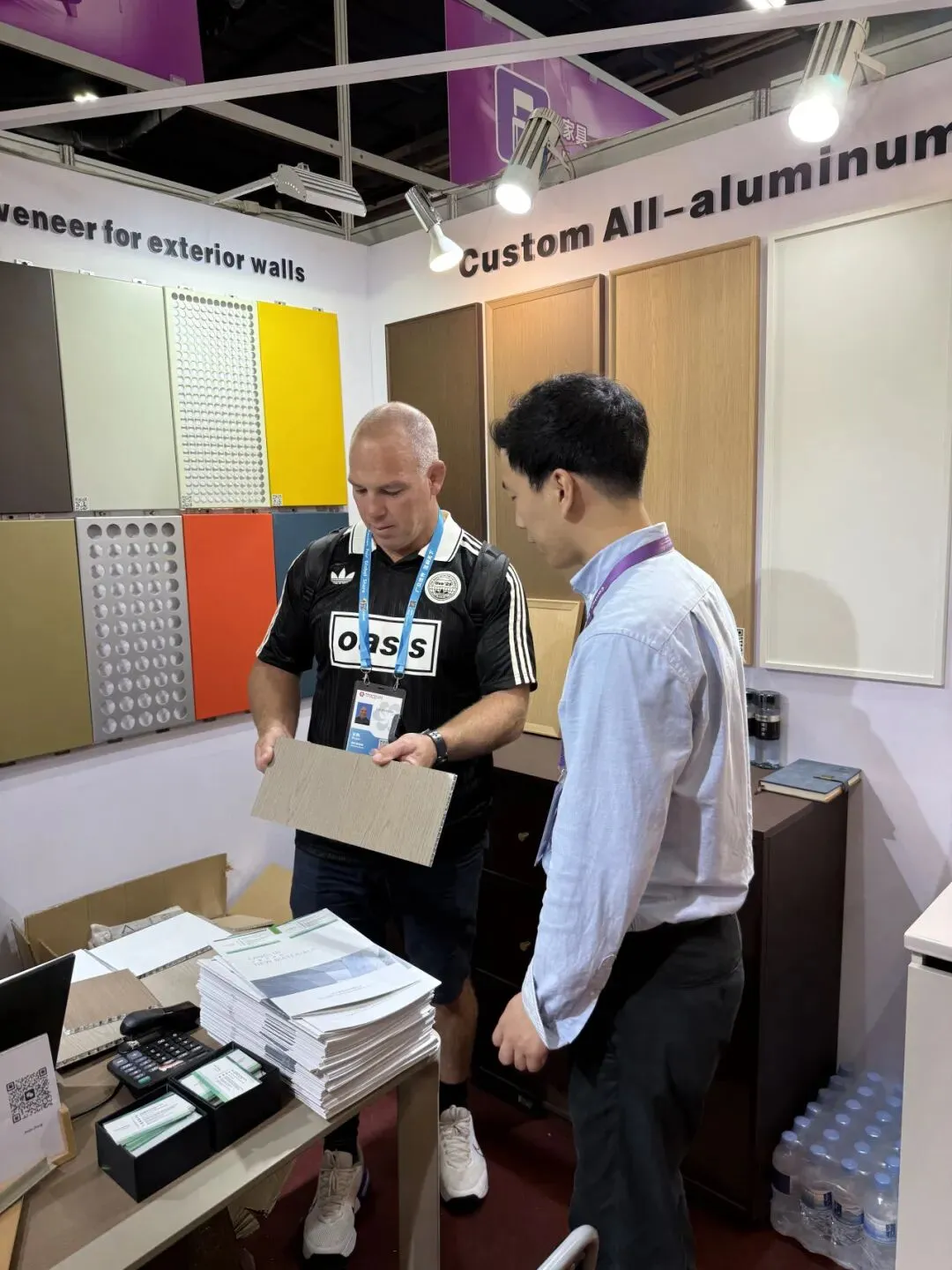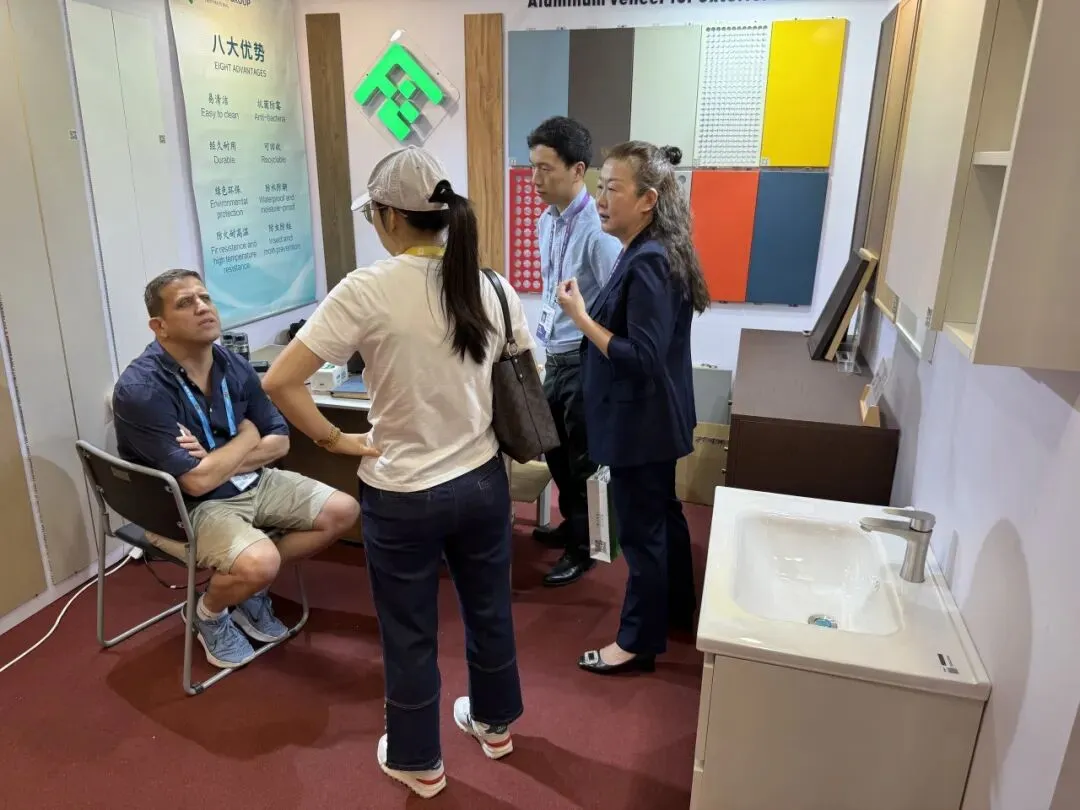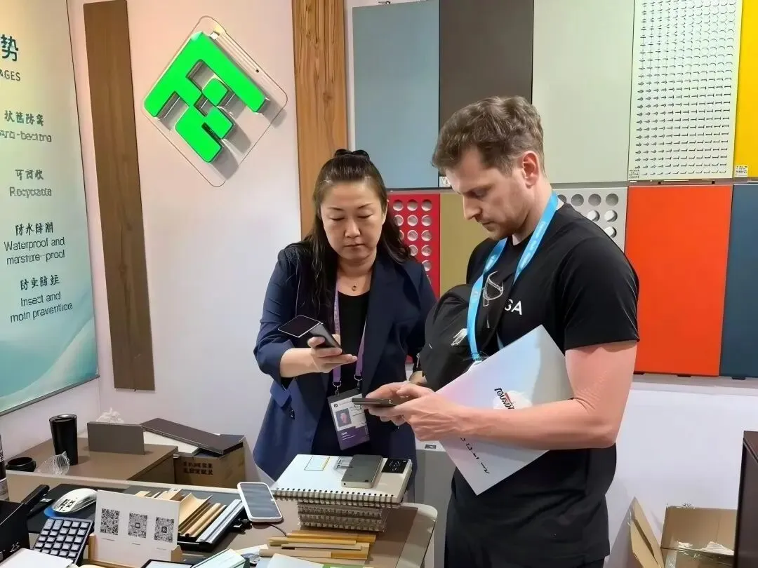 展会期间,西班牙客商是方霖展位到访人数最多的群体之一,他们对方霖内墙板的工艺细节表现出浓厚兴趣,多位采购商详细询问了产品的承重参数、安装方式及定制能力,并带走样品图册约定后续对接。