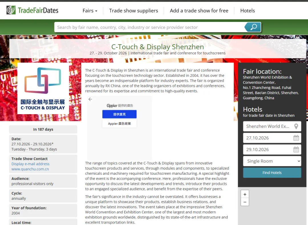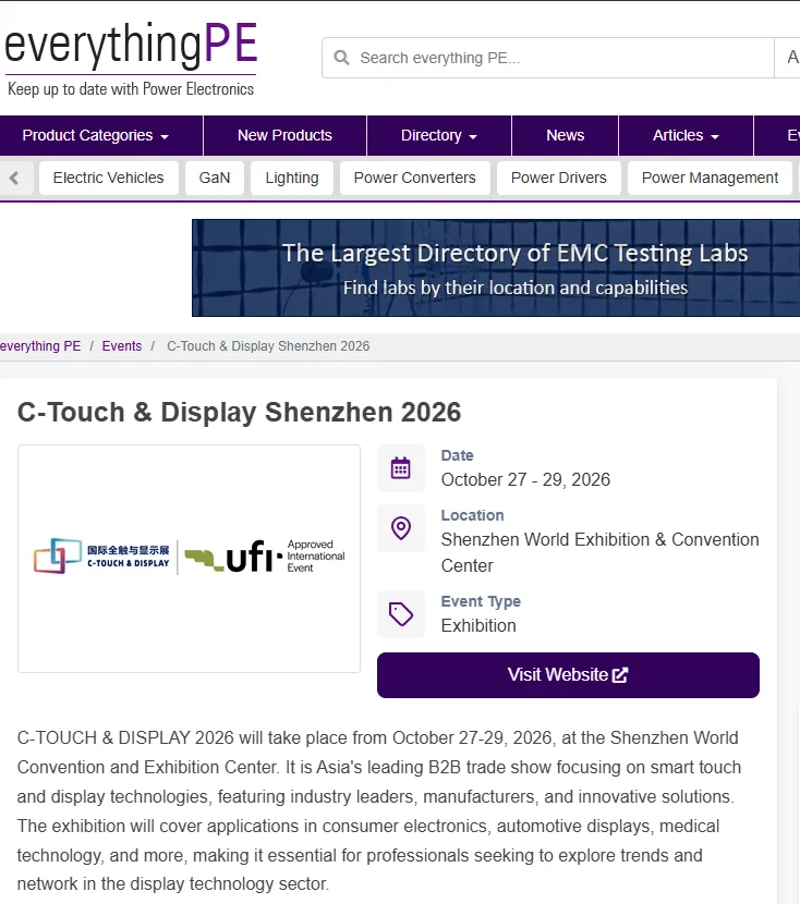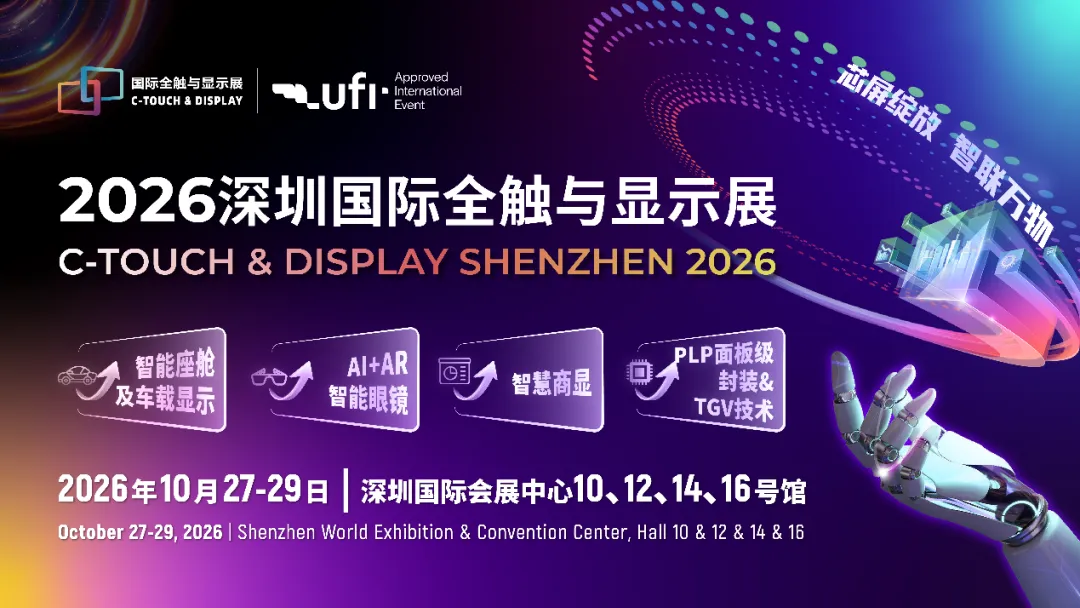 深圳国际全触与显示展(C-TOUCH & DISPLAY SHENZHEN)将于2026年10月27-29日在深圳国际会展中心(宝安新馆)举办,作为智慧触控和新型显示行业的风向标展会,本届展会将联合COMMERCIAL DISPLAY深圳商用显示技术展、FILM & TAPE EXPO深圳国际薄膜与胶带展、AUTOMOTIVE WORLD CHINA 深圳国际智能网联汽车产业展览会、NEPCON ASIA亚洲电子生产设备暨微电子工业展览会、VisionChina Shenzhen中国(深圳)机器视觉展暨机器视觉技术及工业应用研讨会等八展同期,打造18万平方米的超级展览盛宴。