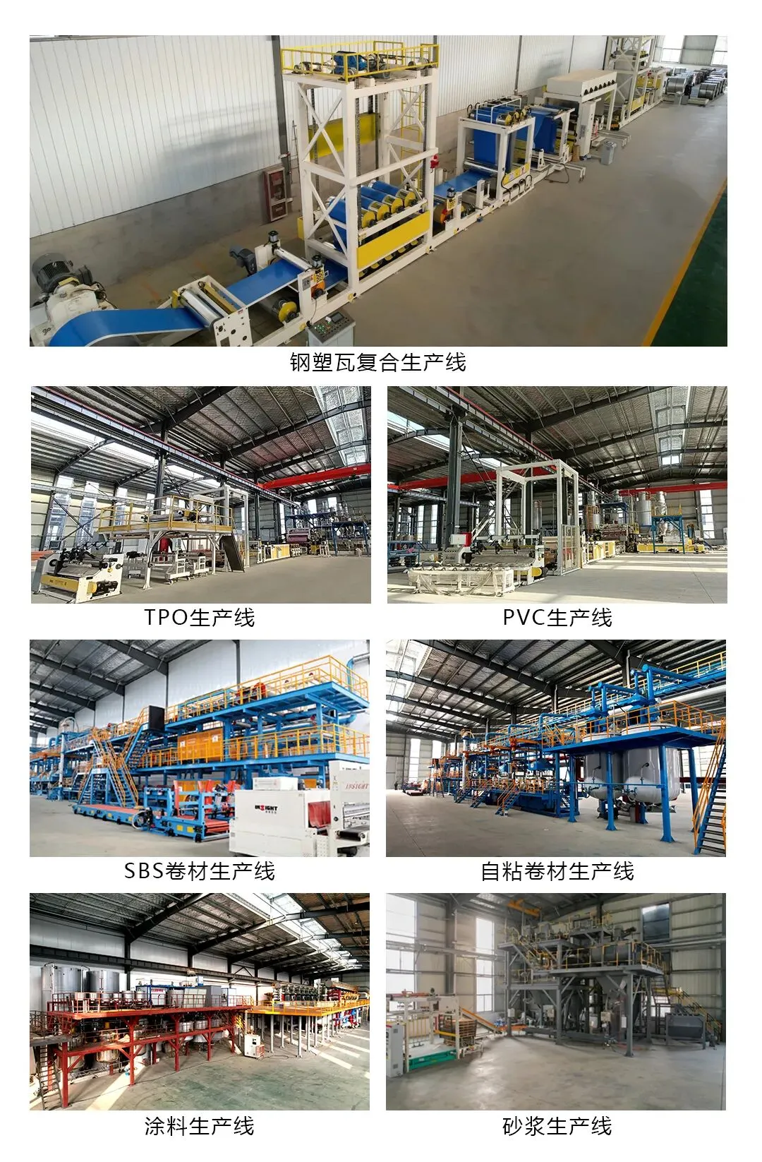 共有先进的生产线20条,年可生产TPO防水卷材1500万㎡、PVC防水卷材1000万㎡、钢塑一体瓦600万㎡、虹吸排水板500万㎡、高分子自粘胶膜防水卷材1000万㎡、沥青卷材2000万㎡、防水涂料3万吨、特种砂浆10万吨 。