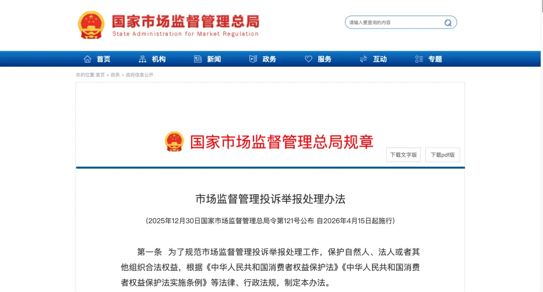 2025年12月30日,国家市场监督管理总局公布了新修订的《市场监督管理投诉举报处理办法》(以下简称“新《办法》”),并于2026年4月15日起正式施行。新《办法》新增6个条款、修改22个条款,核心修订重点包括规制恶意索赔,被业界解读为职业索赔“红利时代”终结的标志性文件。