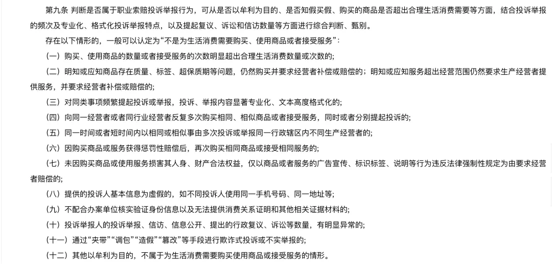 例如,安阳市市监局等八部门于2025年11月4日联合出台的《依法规范市场监管领域投诉举报行为持续优化营商环境暂行规定》,明确列举了12种“不是为生活消费需要购买、使用商品或者接受服务”的情形,涵盖了职业索赔的各种典型套路。