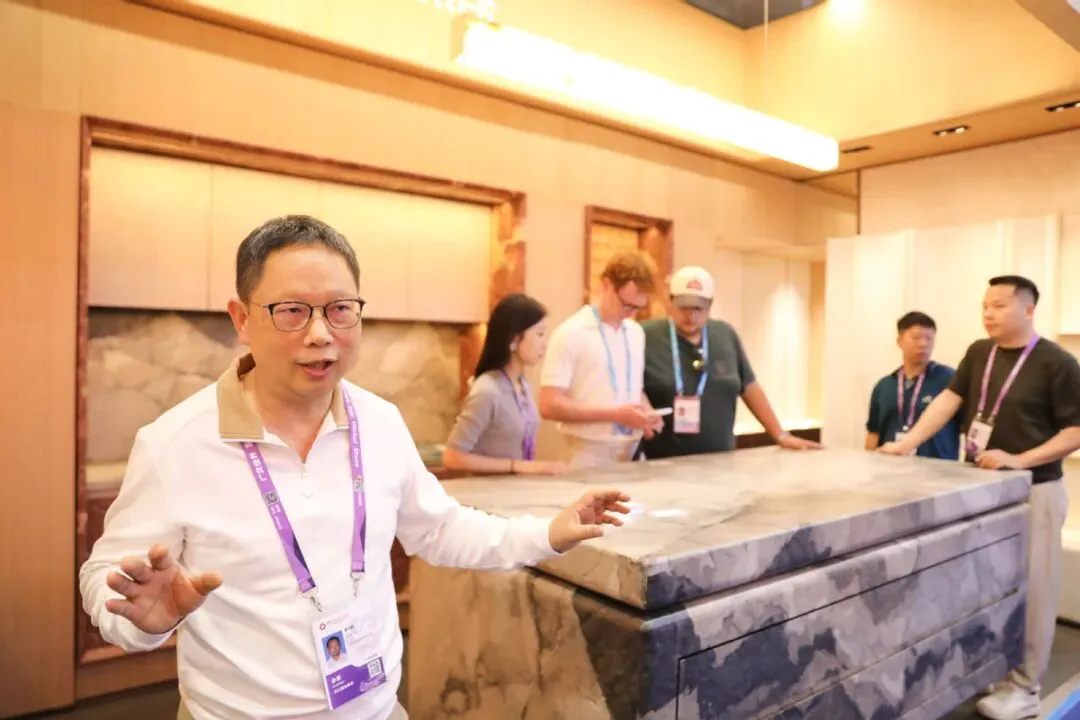 广东名展家居科技有限公司从事外贸23年,专注中东、美国高端酒店与豪宅工程,创新超薄天然大理石、恒温石材等技术,展会首日派发近800份名片,合作20余年的美国老客户持续稳定返单,新客商洽谈踊跃。