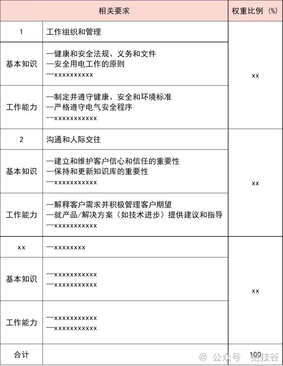 请列表、分项说明对选手理论知识、工作能力的要求以及各项要求的权重比例。例如下表: