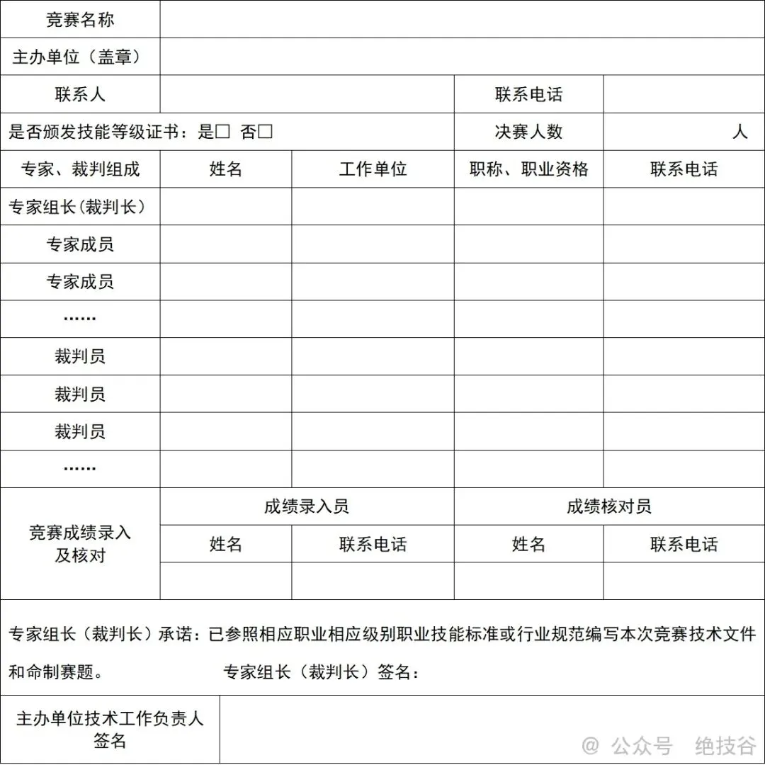 (二)技术工作。第一主办单位要通过遴选或推荐方式确定裁判长,做好裁判人员管理培训和赛事监管,严格按照公布的竞赛项目和竞赛等级开展竞赛活动,确保比赛公平公正。竞赛方案、通知、技术文件等有关材料(详见附件2)请于比赛前40天报省职业技能服务指导中心备案。