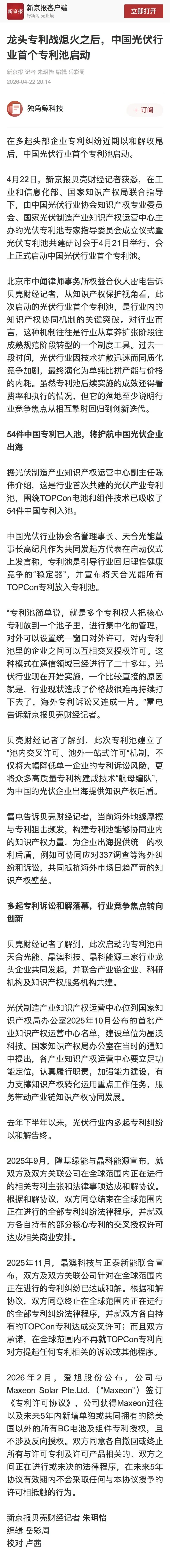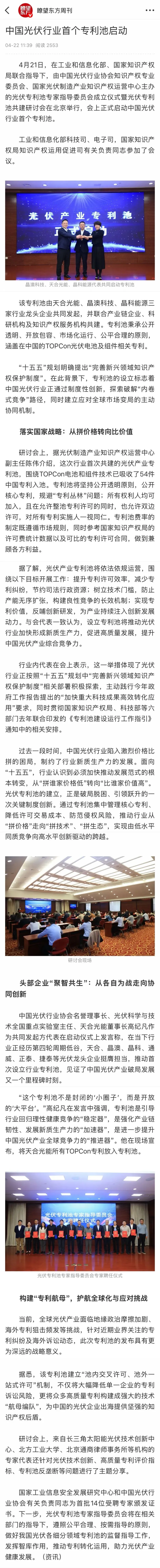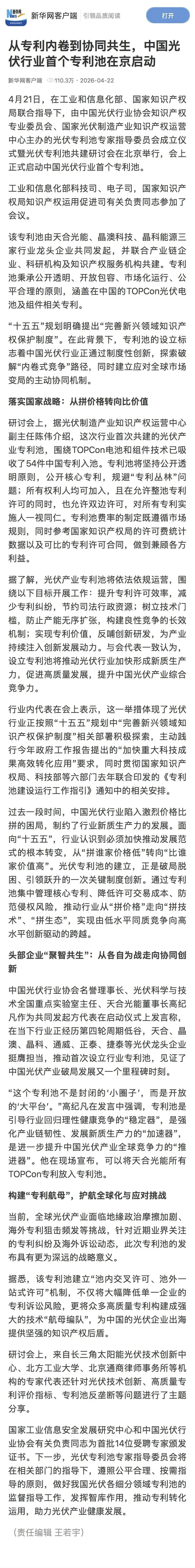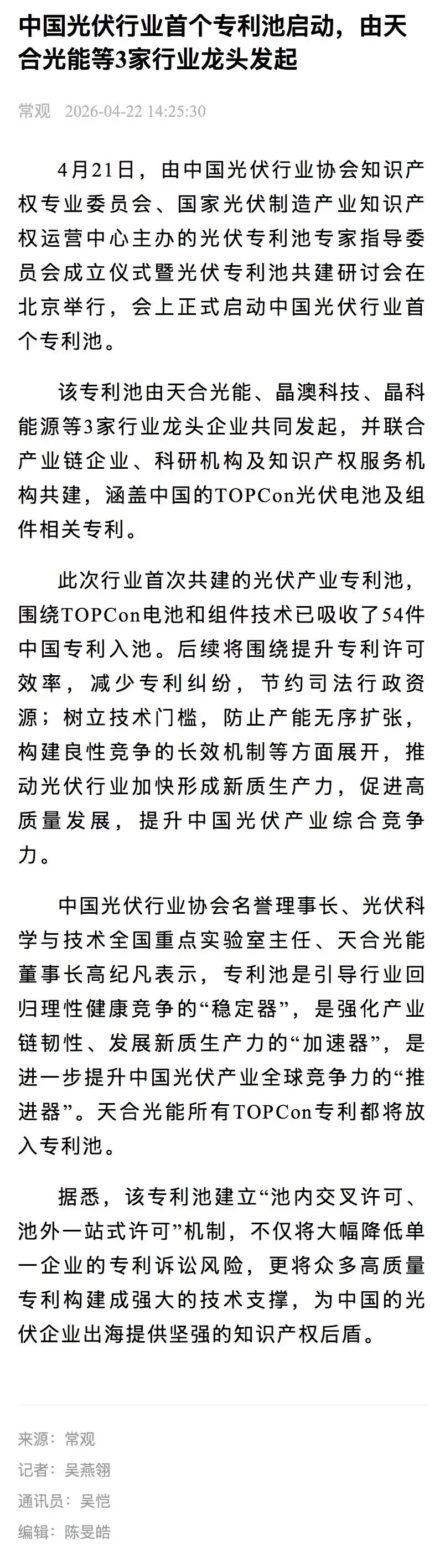 4月21日,在工信部、国家知识产权局联合指导下,中国光伏行业首个专利池正式启动,由天合光能携手晶澳科技、晶科能源等六家龙头企业联合共建,聚焦TOPCon光伏电池及组件领域,以知识产权协同推动行业“反内卷”、迈向高质量发展。此事件获工信部官网、新华社《瞭望》、新京报、中国电子报、第一财经、界面新闻、荔枝新闻等权威机构重点报道。