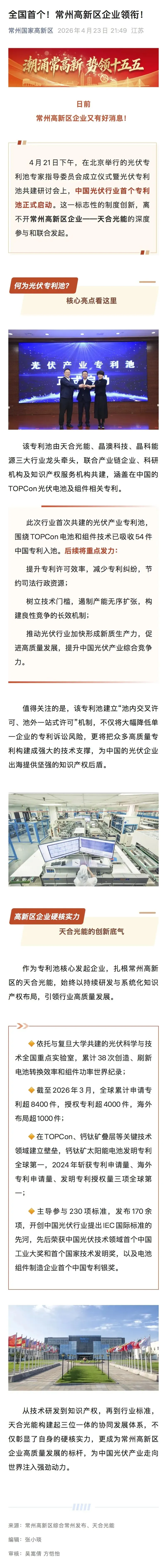 常州发布、常观刊发《中国光伏行业首个专利池启动,由天合光能等3家行业龙头发起》