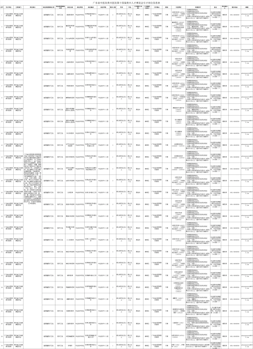 根据工作需要,广东省中医院贵州医院参加第十四届贵州人才博览会引才,共设置29个岗位,拟引进硕士研究生52名,均为专业技术人员。具体引才岗位及要求见《广东省中医院贵州医院第十四届贵州人才博览会引才岗位信息表》(附件1)。