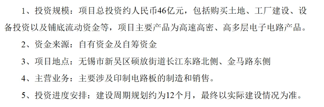 4月24日深南电路投资公告显示,公司全资子公司无锡深南电路有限公司计划在无锡市新吴区投资46亿建设建设高速高密、高多层电子电路产品项目,项目主要产品是高速高密、高多层电子电路产品。