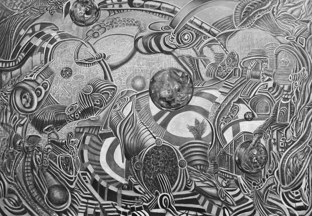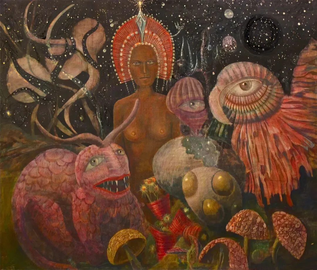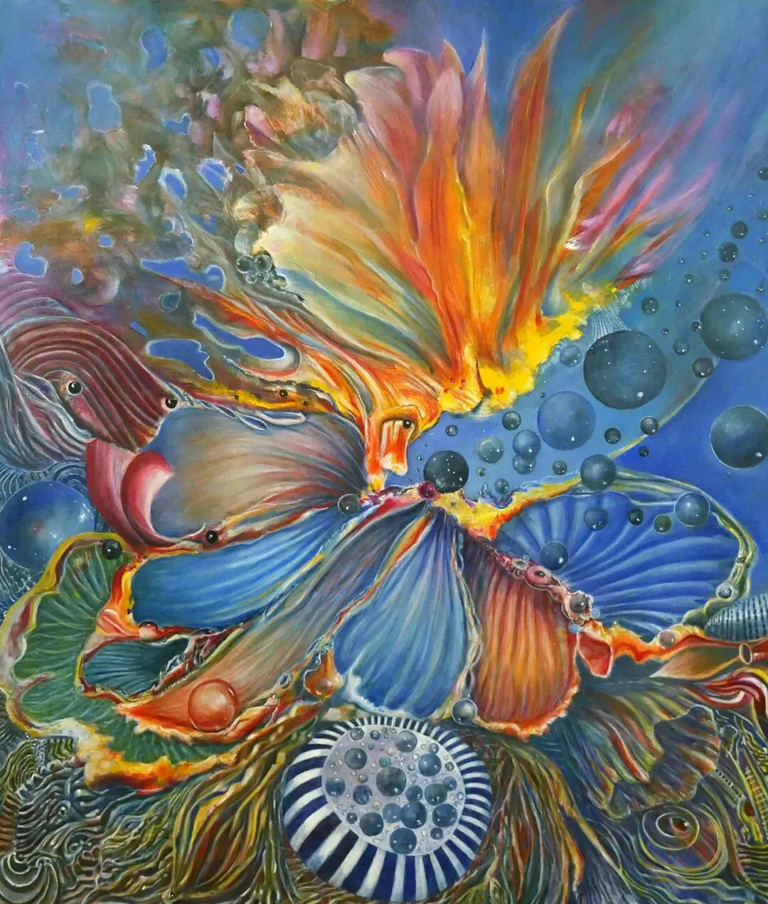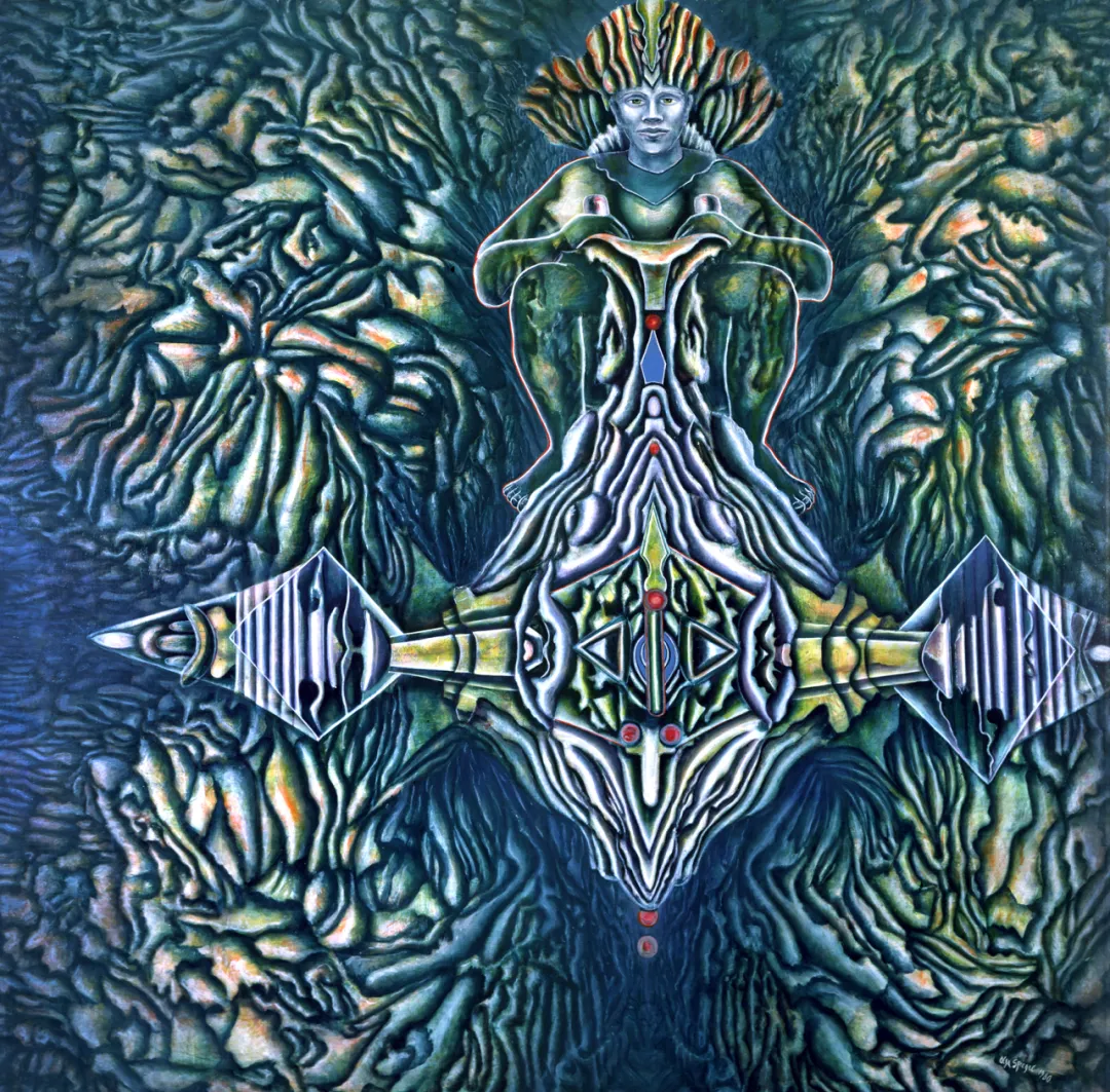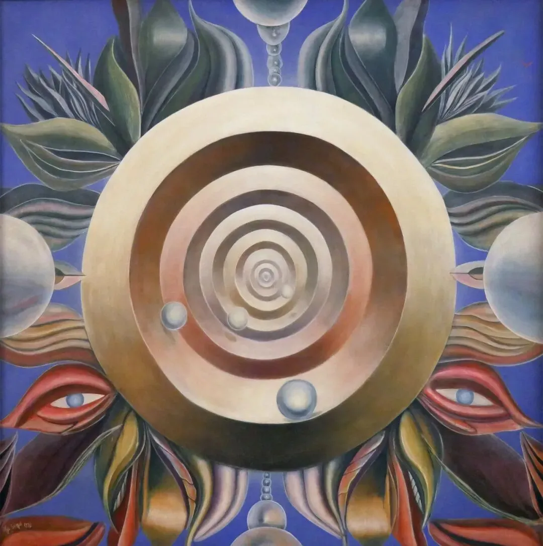 其后,艺术家发展出一种独特的视觉语言,将自然、科技与神秘学(occult)等元素融为一体,构建出既具象又超现实的图像体系。