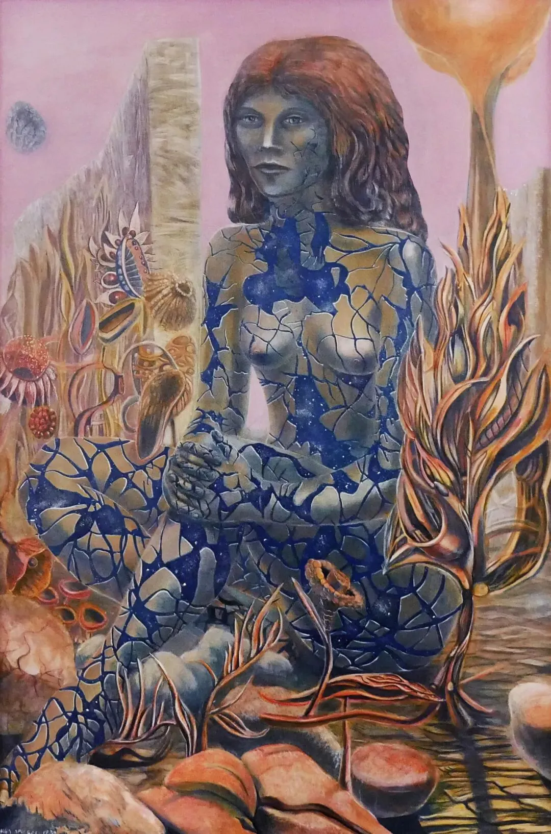 作为魔幻现实主义(Magical Realism)的重要代表之一,Olga Spiegel的早期创作跨越欧洲、中东与美国。她曾就读于比利时皇家美术学院,并在英国伦敦圣马丁艺术学院接受学术训练。在维也纳期间,她参加了由奥地利“奇幻现实主义”代表画家Ernst Fuchs主持的研讨课程。通过系统的学院训练与跨文化经历,Spiegel逐步形成了其高度精密的绘画技法,并深入研究古典大师的创作传统。