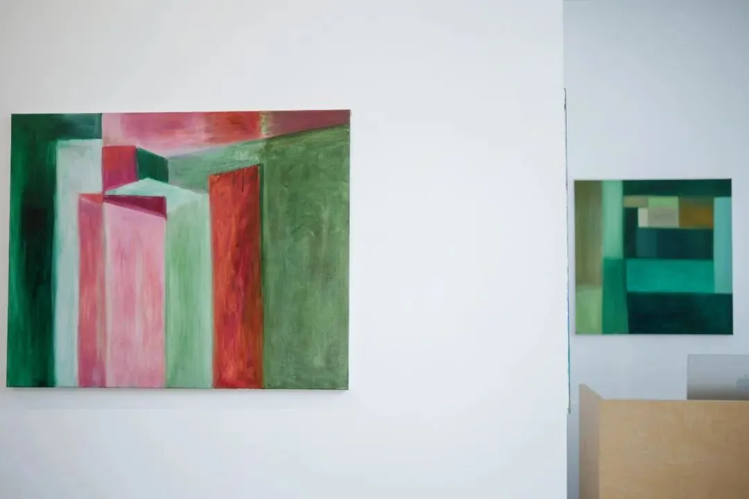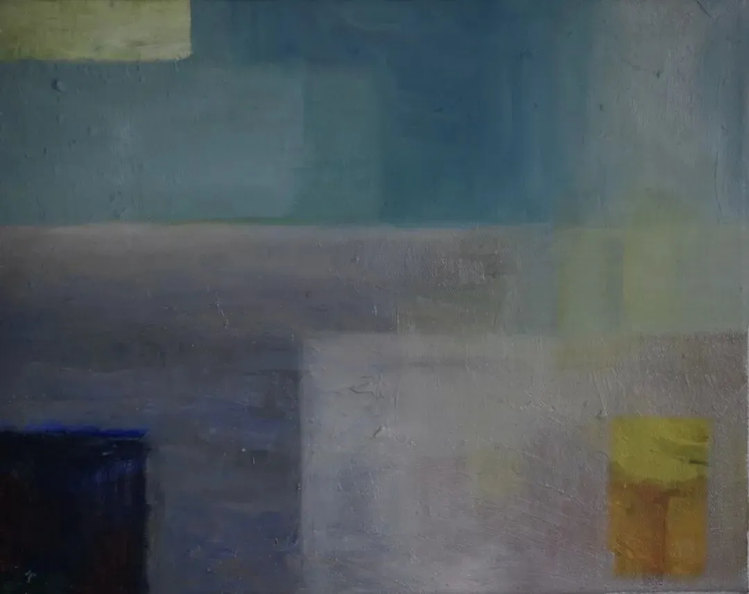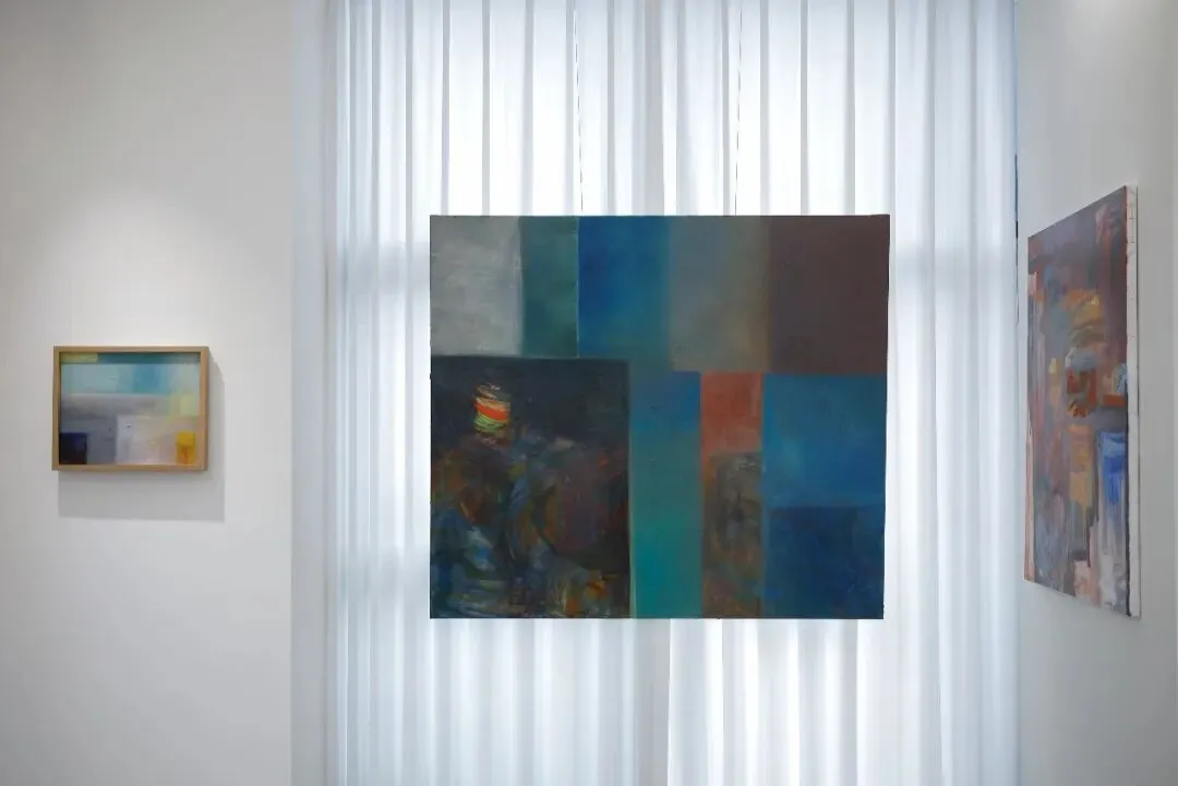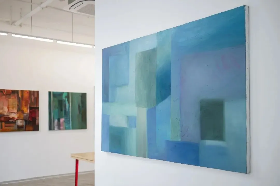在《抵达呼吸》系列中,我们看到冷色调的色块如同潮汐般进退,层层叠叠的罩染技法,使色彩在覆盖与显露之间形成节奏,让色彩拥有了呼吸的厚度。这种创作态度不追求瞬间的爆发,而是在反复的涂抹与覆盖中,校准画面内部的时间感。无论是静默的沉思还是瞬间的悸动,她将身体经验转化为画布上可被阅读的视觉刻度。