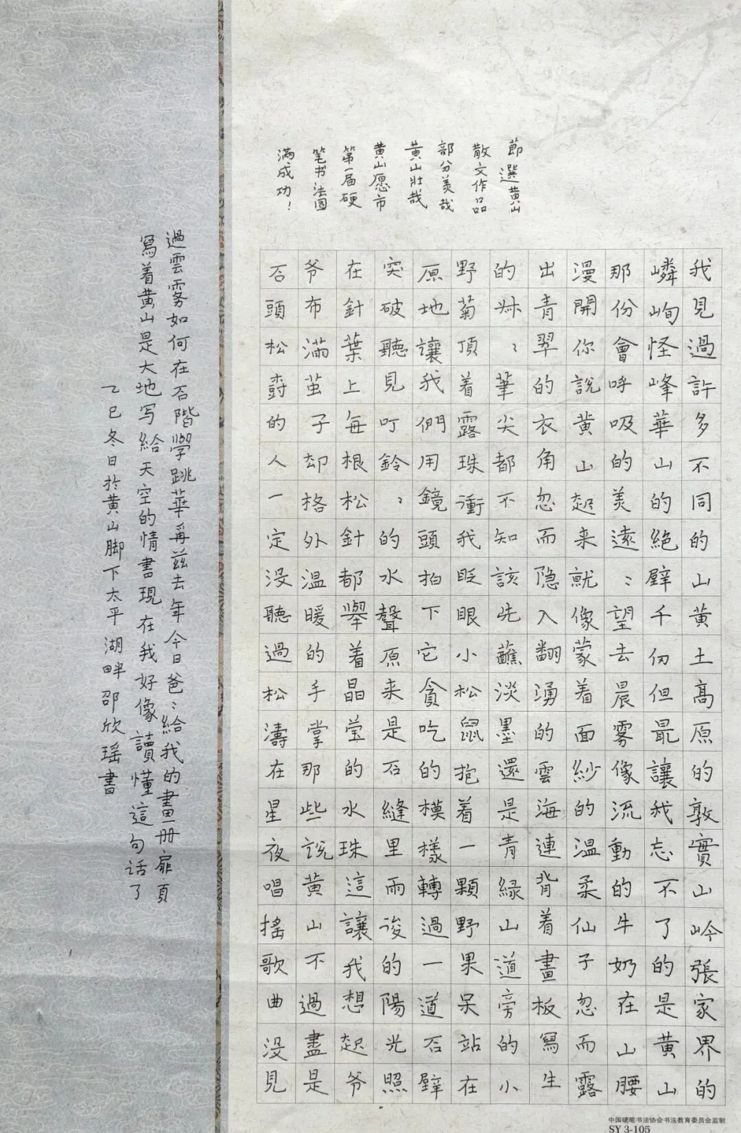 为弘扬中华优秀传统文化,传承汉字书法艺术,繁荣徽州文艺事业,由黄山学院艺术学院、黄山市硬笔书法家协会联合主办的首届“迎客松杯”黄山市硬笔书法大赛已圆满完成评审工作。本次大赛自征稿以来,得到全市各界硬笔书法爱好者踊跃参与,参赛作品内容丰富、格调高雅,既有对经典诗文的深情书写,也有饱含时代气息的原创篇章,佳作纷呈、风格多元,充分展现了黄山市硬笔书法群体的扎实功底与蓬勃朝气。