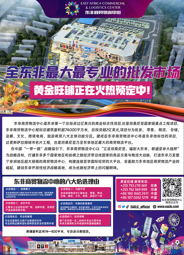 其在坦桑尼亚投资建设的东非商贸物流中心是东非最大的现代商业综合体和展览中心,项目建成后将成为辐射东非14亿人口的商业和分销中心,成为非洲商业、贸易和物流的桥头堡,连接东非和世界。