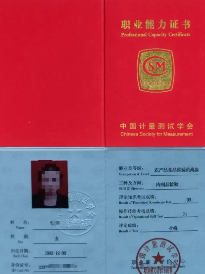资质权威性:颁发全国通用的《肉制品检验员职业能力证书》,官网永久可查,终身有效,是肉制品企业、第三方检测机构、政府监管部门等领域的法定上岗资质,也是企业申请SC认证、ISO22000审核的必备条件。