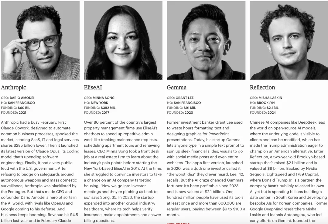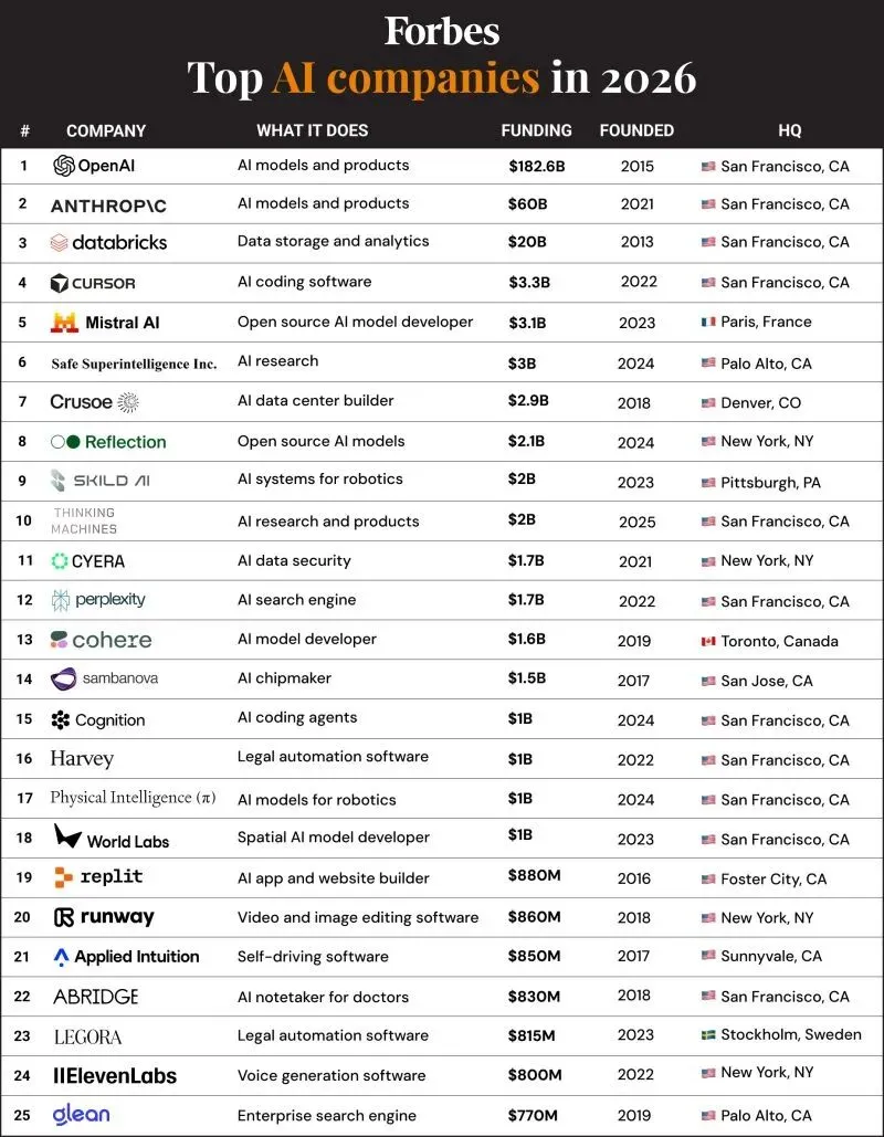 福布斯全球 AI 初创 50 强榜单刚刚公布,这份榜单聚焦全球最具发展潜力的非上市人工智能企业。OpenAI、Anthropic 等行业巨头依旧稳居榜单头部,吸引硅谷顶尖风投与科技巨头史无前例的巨额资金注入,据悉两家都在筹备重磅 IPO 上市。两大 AI 巨头合计融资达2426 亿美元,占到本届 AI 50 强总融资额3056 亿美元的近八成。旗下产品被大规模采用,也带动营收强劲增长:截至 2 月底,OpenAI 年化营收已超 250 亿美元;4 月初,Anthropic 营收年化增速突破 300 亿美元。凭借 Anthropic 的Claude Code、OpenAI 的 Codex 等产品,这两家 AI 实验室正强势抢占代码开发等赛道,也迫使 Cursor等同行持续创新、应战竞争。
