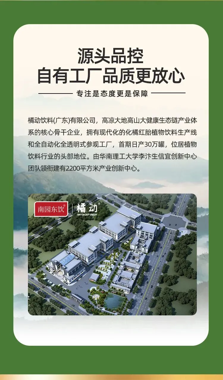 橘动饮料是茂名地区较早自建化橘红饮料专业生产线的企业之一,生产基地位于信宜,从干果低温萃取、无菌灌装到成品检测,全流程自主完成,不依赖代工模式,每一批次产品可追溯,品质可控。
