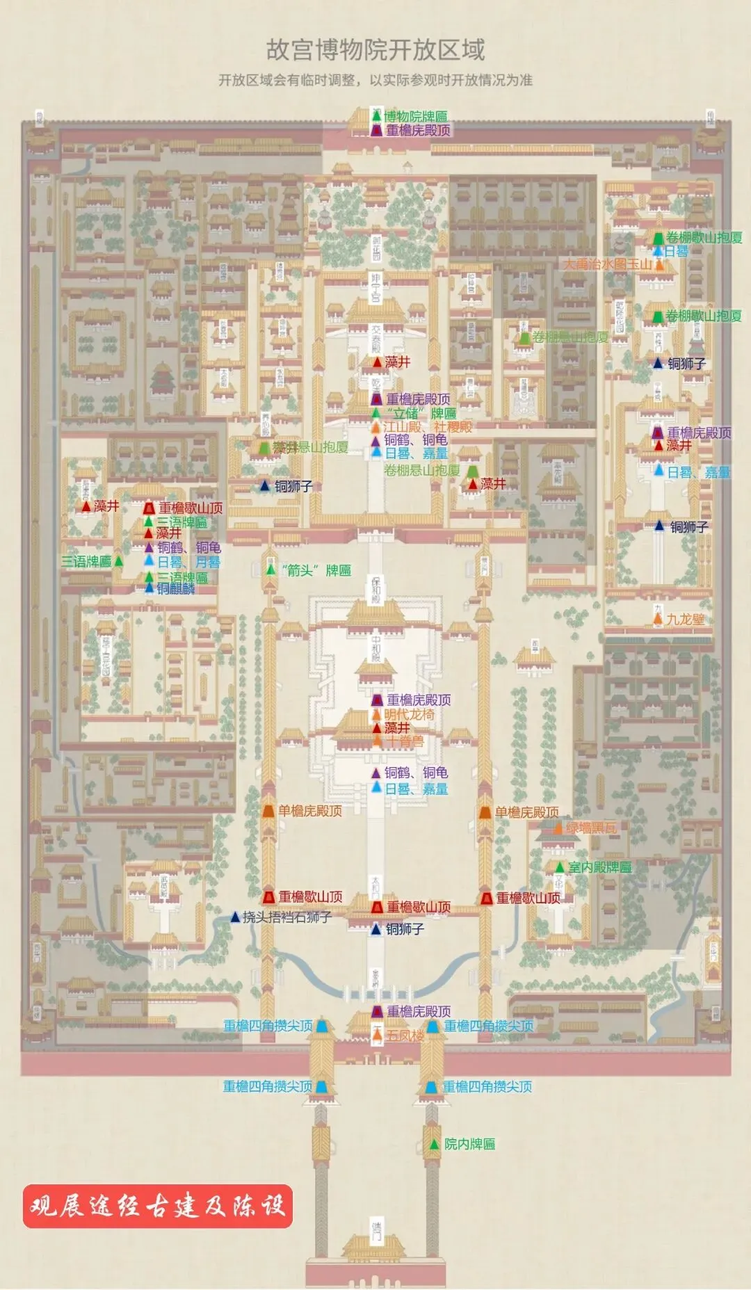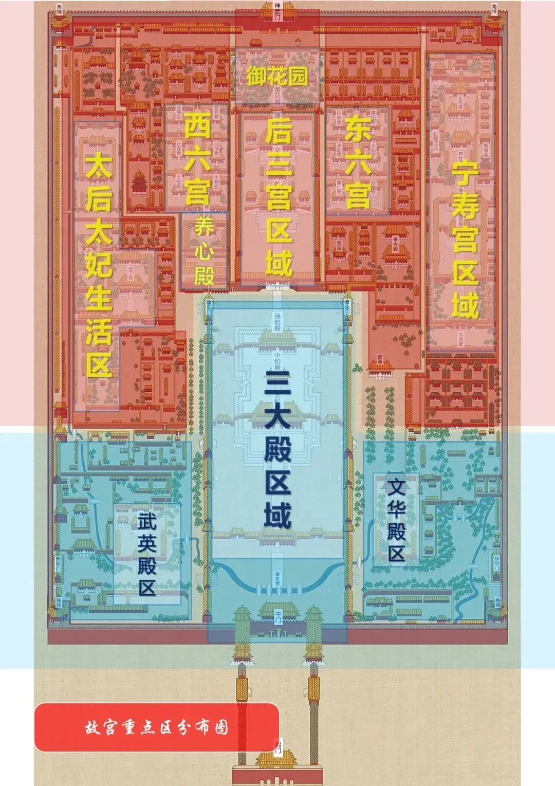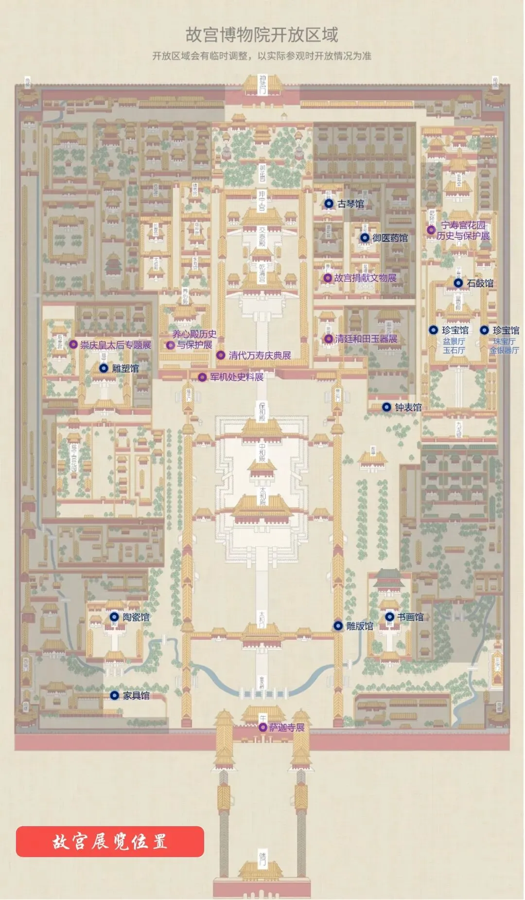 针对当前开放区域,重点关注区域大致可分为前朝三大殿区、文华殿区、武英殿区、后三宫区、御花园、东六宫、西六宫、宁寿宫区域、慈宁宫&寿康宫区等。其中,知名度非常高且单独收费的两馆,珍宝馆位于宁寿宫区域,钟表馆位于东六宫南侧的奉先殿南群房。