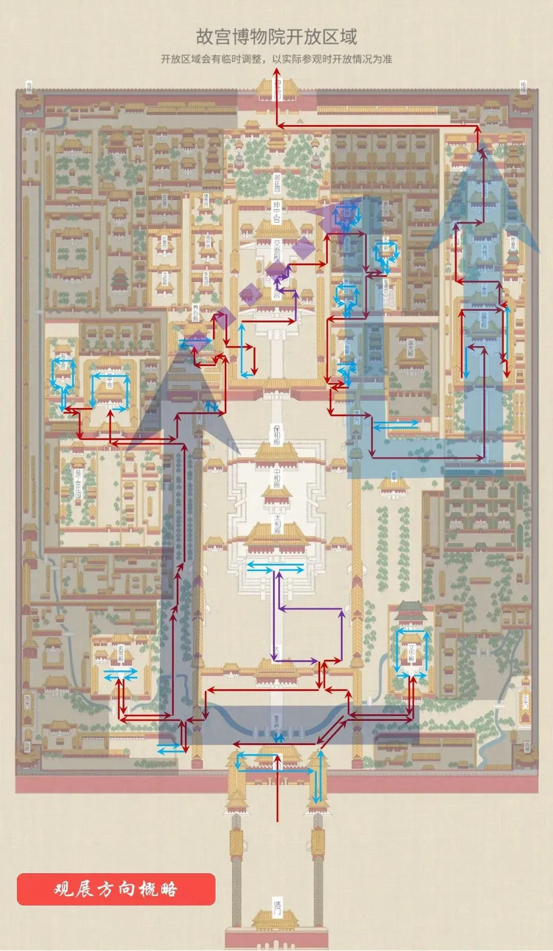 蓝色是展览,红色是途经古建及陈设,紫色是展览+古建或陈设