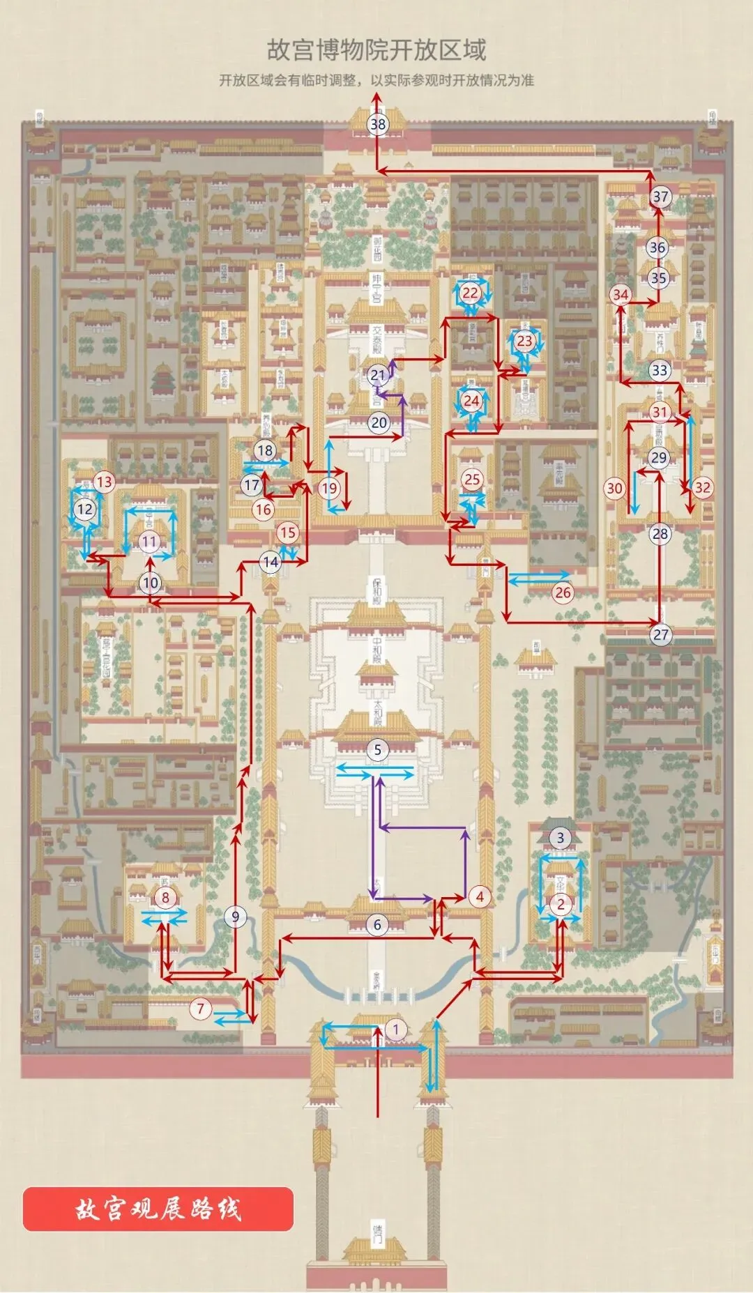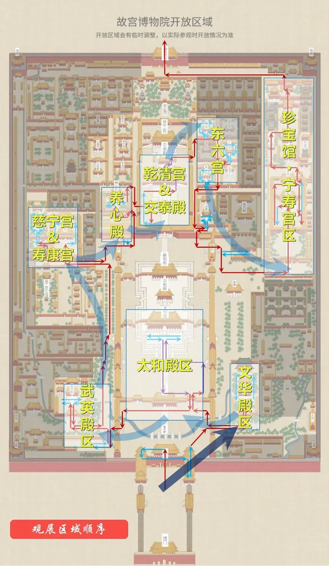 午门(入口)>>>>>文华殿区>>>(太和殿)>>>武英殿区>>>>>慈宁宫&寿康宫区>>>>>养心殿区>>>(乾清宫)>>>东六宫及斋宫>>>>>珍宝馆 · 宁寿宫区>>>>>午门(出口)