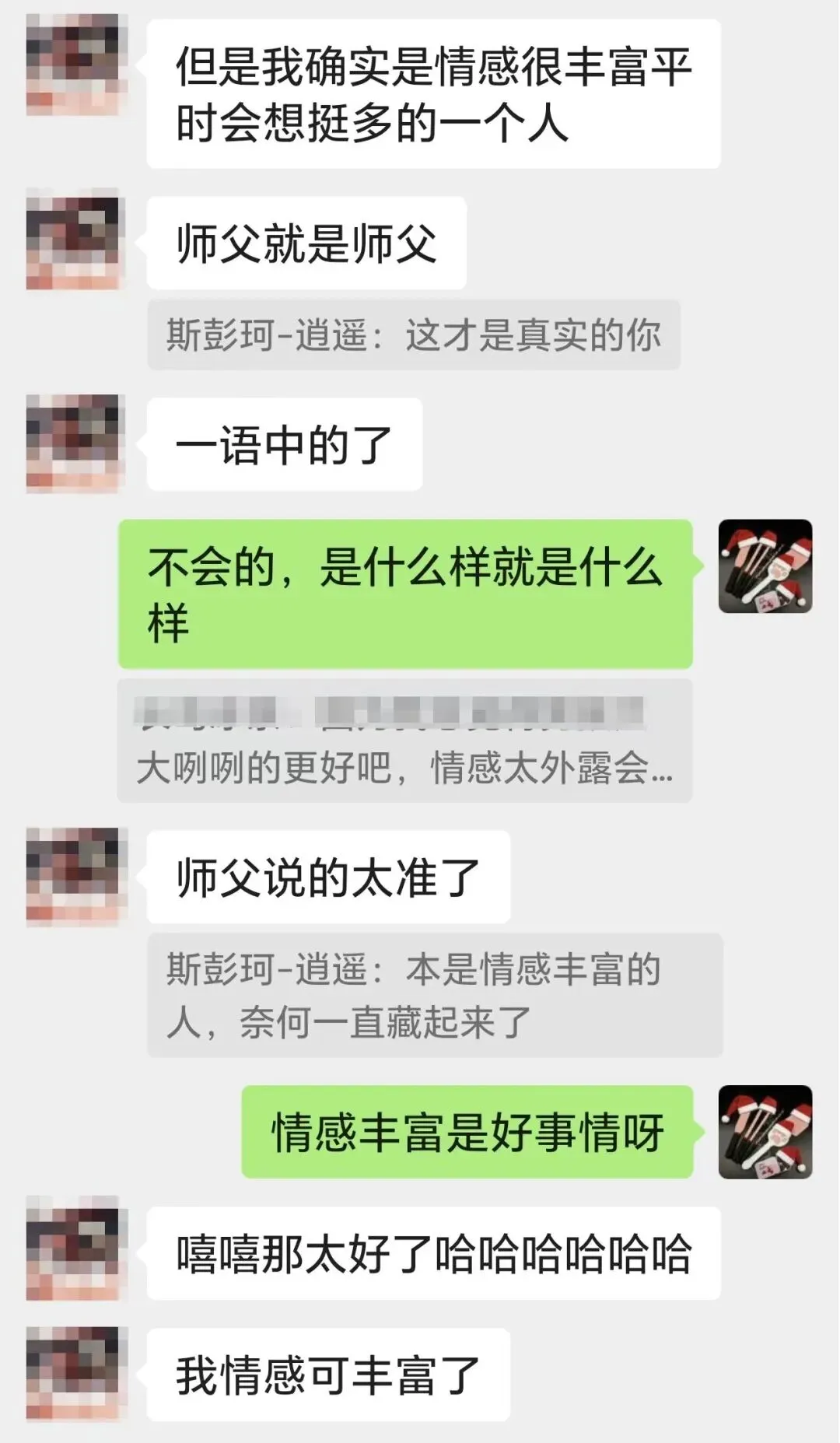 我知道这是逍遥姐姐,不,以后应该叫师父,对我最大的认可,当时我本能的膝盖一软,也顾不得在酒店门口,直接跪地拜师了,旁边的叶卡姐姐还磕了三个。可是我一直非常惶恐,我是有比较严重的被夸羞耻症的,包括大家都在起哄说我“优质男主”的时候,其实我心里比谁都清楚,与我师父,与优秀的大家相比,我不过是个22岁的小孩,大学还没毕业的学生,我还太嫩了,完全担不起“优质男主”这四个字,我担心大家对我过分的赞誉过后发现我其实真的很嫩,也很幼稚,结果大家发现我比想象中差劲很多之后就对我彻底失望,我很害怕失去好不容易找到的大家。这其实给了我很大压力,后面和阿曜聊天的时候她安慰我说,逍遥姐姐收你当徒弟就是承认你了,你跟着逍遥姐姐好好学,肯定会变得越来越优秀的。如果我真的有朝一日变优秀的话,斯彭珂的每一个小伙伴都有一份功劳。